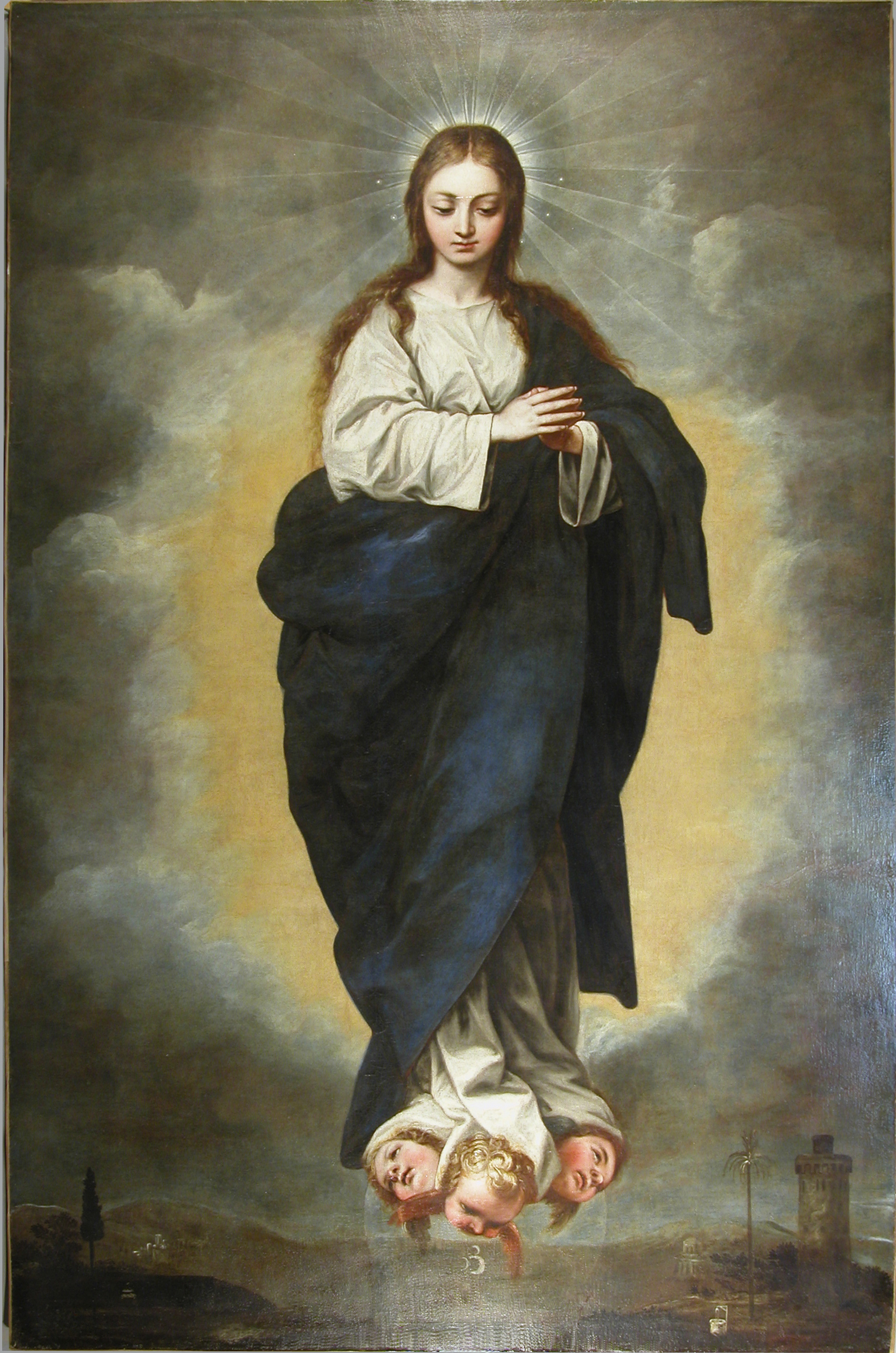 Cuadro dedicado a la Virgen Inmaculada que centra la composición, directamente inspirada en modelos canescos. Rodeada de un óvalo de rompimiento de gloria se dispone la figura de María, joven, de largos cabellos, vestida con túnica blanca y manto azul, con las manos unidas en actitud orante, coronada por las 12 estrellas del Apocalipsis. De su cabeza emanan rayos de luz y apoya sus pies en un traslúcido globo lunar y tres cabezas de querubines. En la parte inferior apreciamos un austero paisaje con los atributos de la letanía lauretana.
