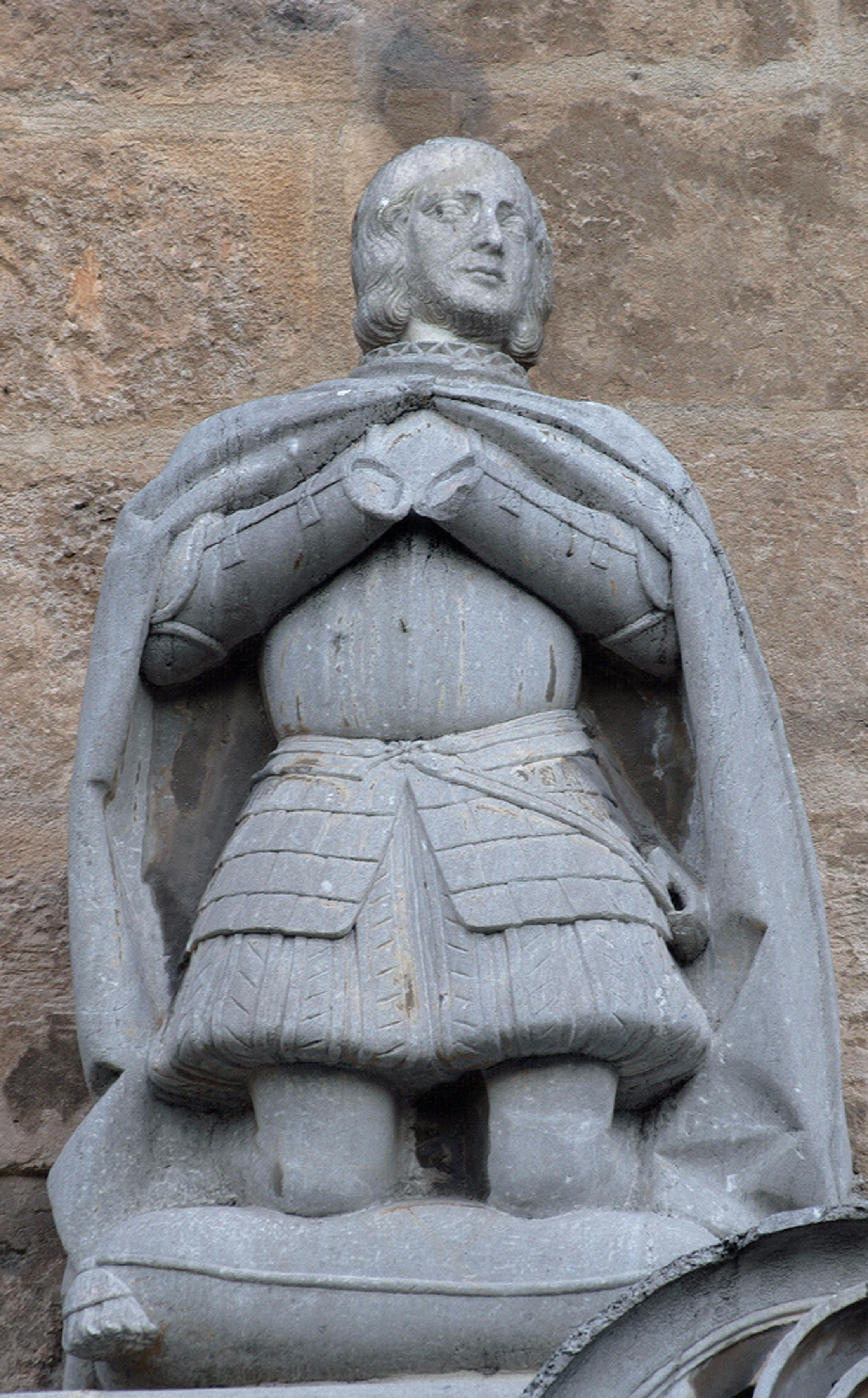 Estatua orante de D. Fernando el Católico, arrodillado sobre un almohadón con la cabeza vuelta hacia la izquierda, donde se halla la hornacina de la Virgen con el Niño. Viste armadura corta y una amplia capa que le cubre la espalda. De rostro firme y severo, permanece en actitud orante, con las manos juntas sobre el pecho. Escultura un tanto tosca, sin duda obra del taller de Alonso de Mena (1587-1622), que sirvió de puente entre Pablo de Rojas y Alonso Cano, marcando lentamente una leve inclinación por el camino naturalista en contra de las enseñanzas manieristas del propio Rojas, con avances de estilo sorprendentes, pero servidas por una técnica pobre y amanerada. La presencia de los Reyes Católicos en la portada se justifica plenamente por haber sido sus fundadores en 1504.