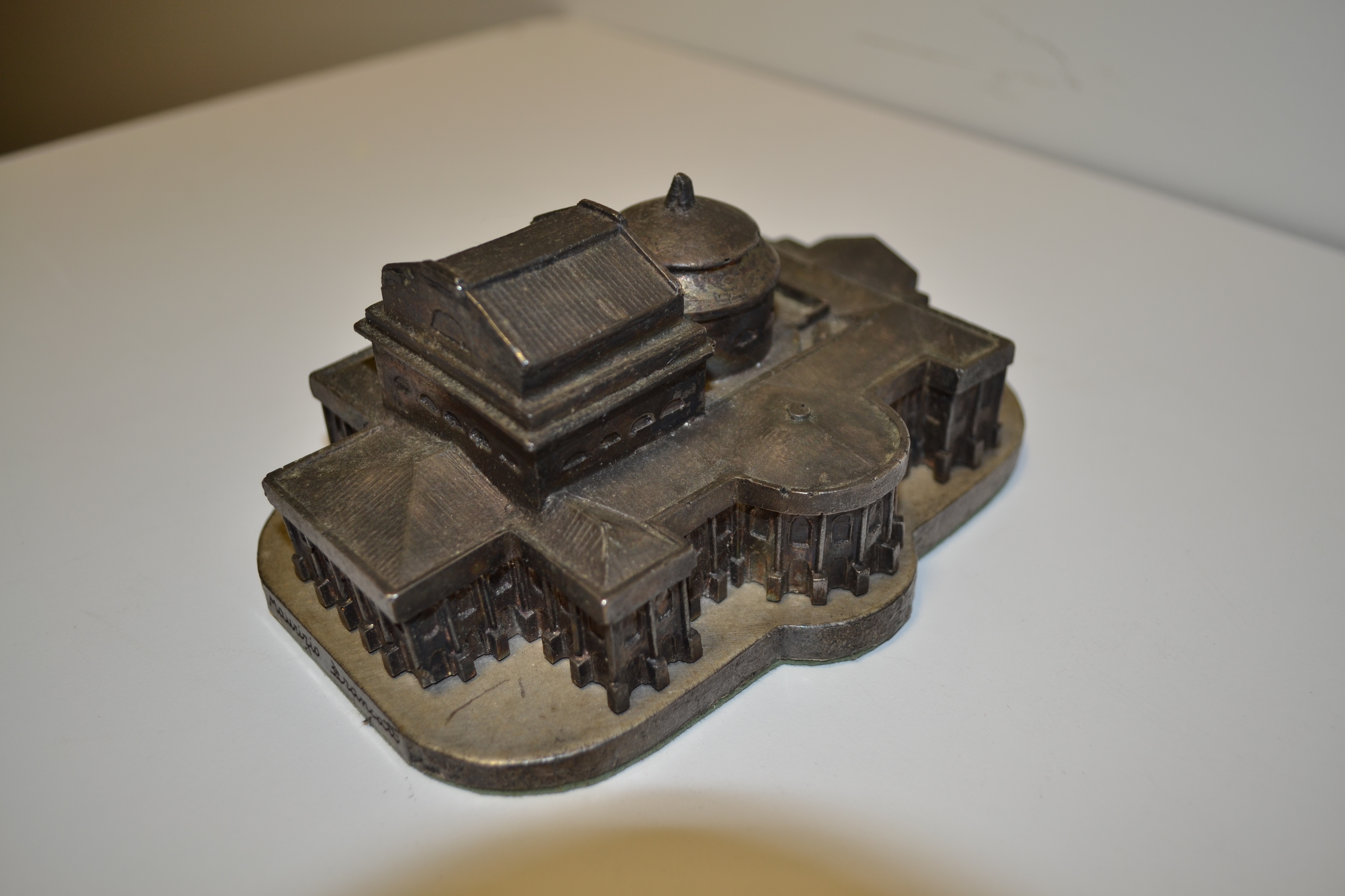 Una pieza de metal plateado realizada en bulto redondo realizada con gran minuciosidad ya que aparecen los elementos arquitectónicos muy detallados, representa el Teatro Massimo de Palermo.