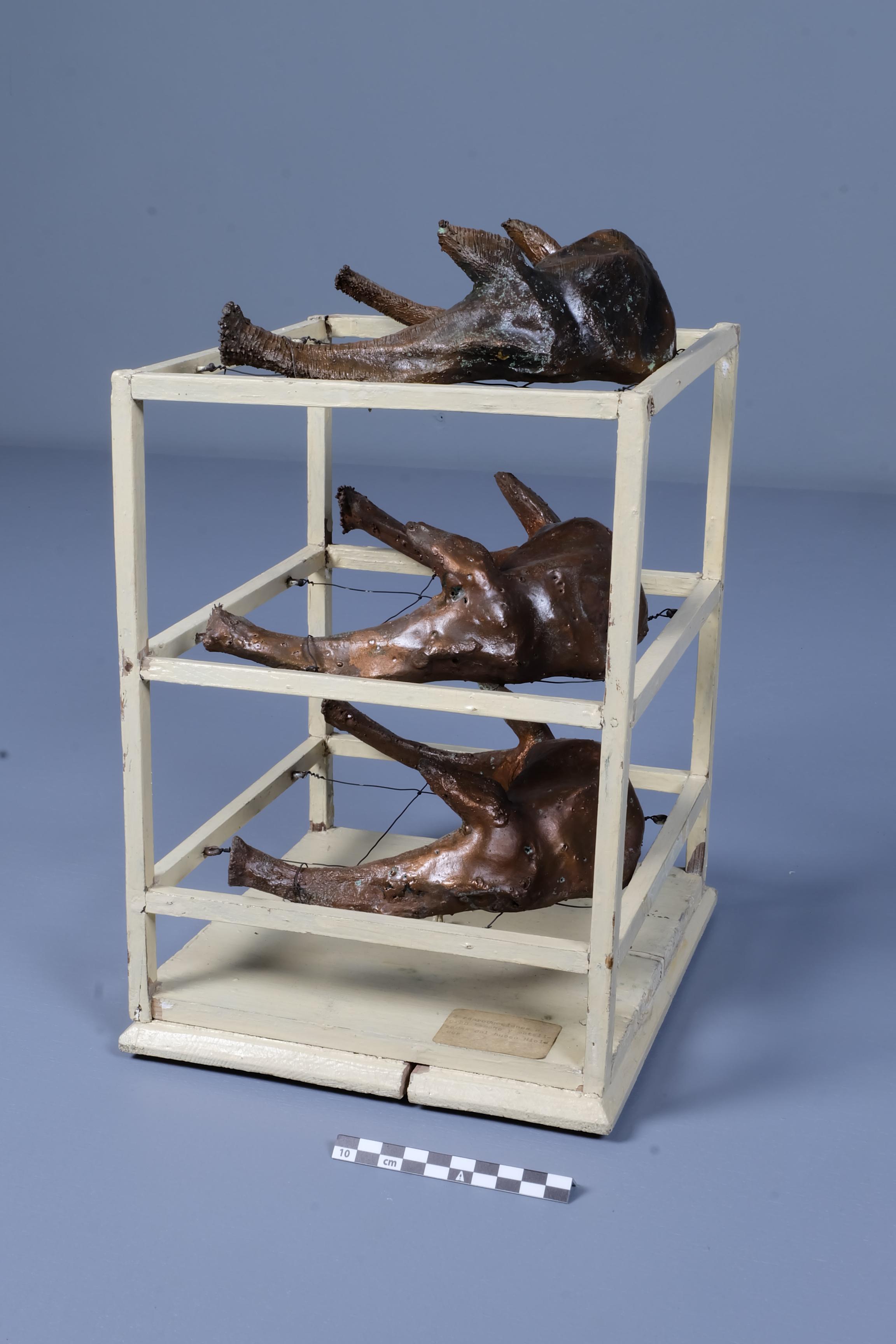 La obra está compuesta por un mostrador de madera en tres niveles que sostiene con alambre tres modelos de gran detalle reproducidos a mayor escala del hueso hioides. Estas reproducciones están realizadas en escayola y recubiertas de una pintura metalizada, con repintes posteriores mate en zonas puntuales.