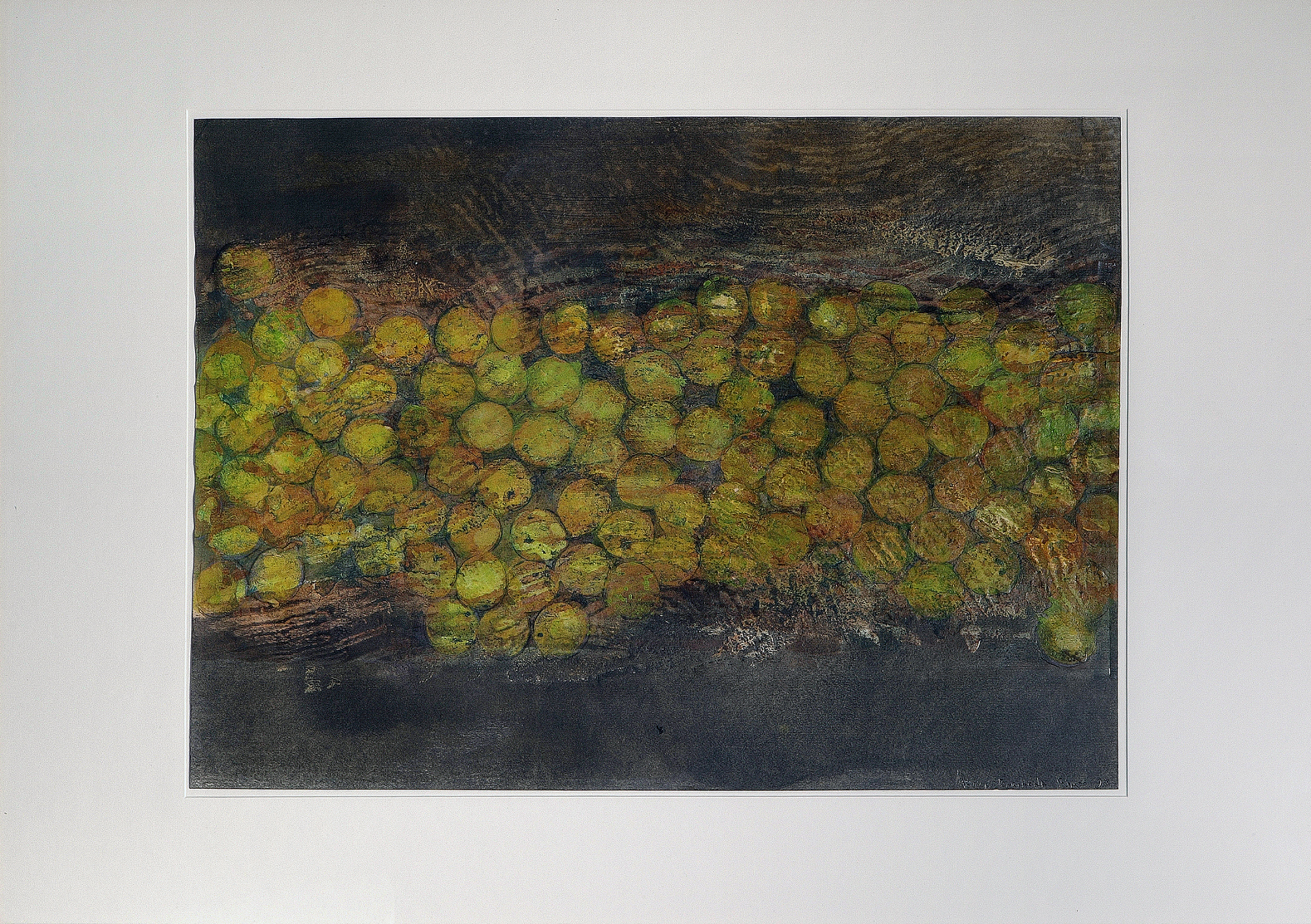 Naturaleza muerta realizada a pastel sobre soporte a papel en doble encuadre. La composición es equilibrada y armónica cromáticamente con una pincelada suelta y abocetada sobrepuesta donde el fondo llega a ser neutro en el ángulo inferior de la obra mientras que, en la zona intermedia y superior es más nítida mostrando incluso las vetas de la madera de lo que podría ser una mesa. Las futas o verduras destacan sobre el fondo en una paleta cálida de amarillos, verdes y tonos tierra primando de forma ligera la línea sobre el color para dar forma a la pincelada a manchas pero de manera velada dado que en algunos detalles lleva a traspasar el fondo. El resultado es un bodegón de perspectiva aérea que pone la atención sobre el conjunto de frutas ordenadas y conseguidas de manera minuciosa.