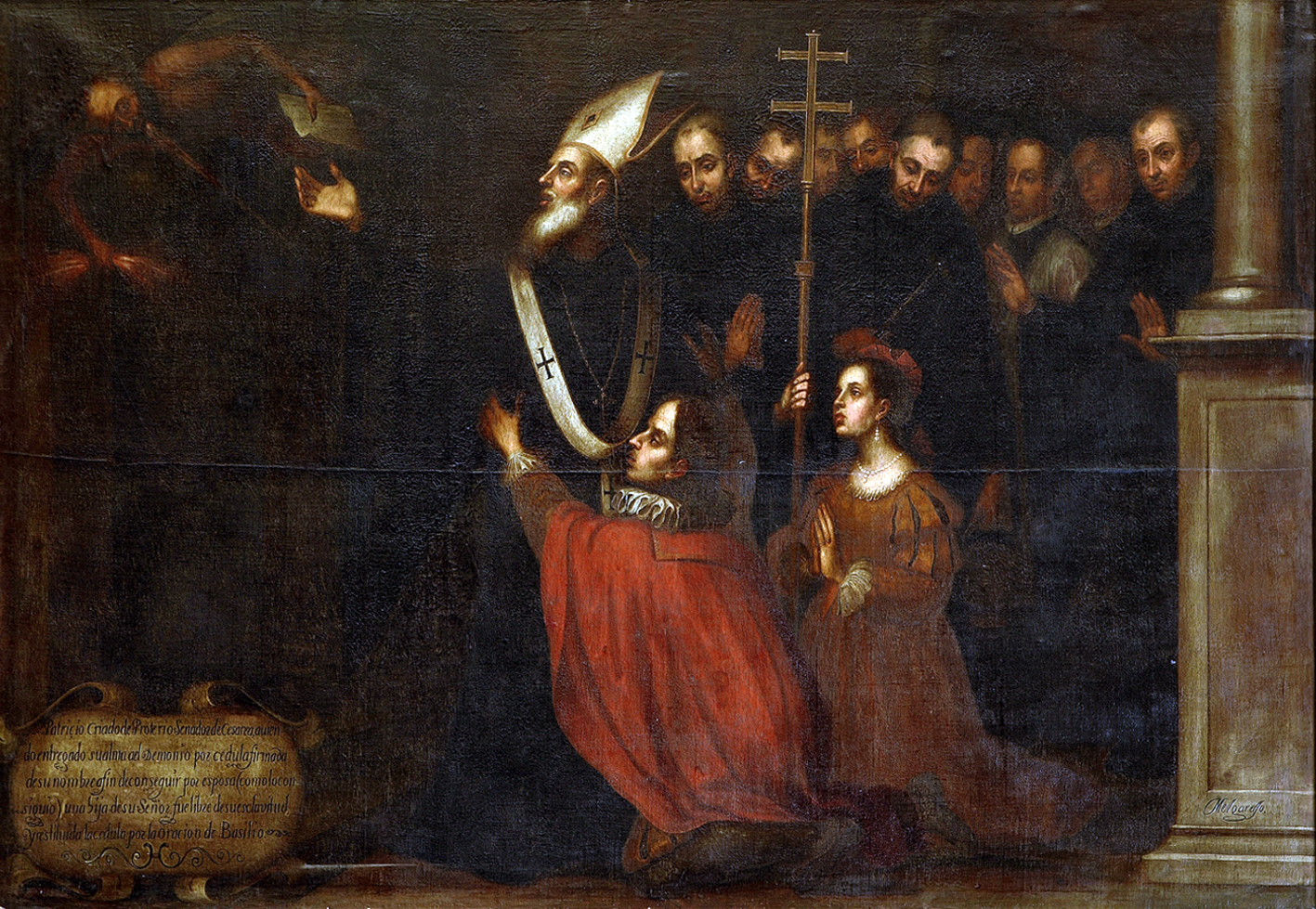En el ángulo inferior izquierdo aparece una cartela con la siguiente inscripción: "Patriçio, criado de Proterio, Senador de Cesarea; avien- / do entregado su alma a el Demonio por cedula firmada / de su nombre a fin de conseguir por esposa (como lo con- / siguio) una hija de su Señor, fue libre de su esclavitud, / y restituida la cedula por oración de San Basilio".