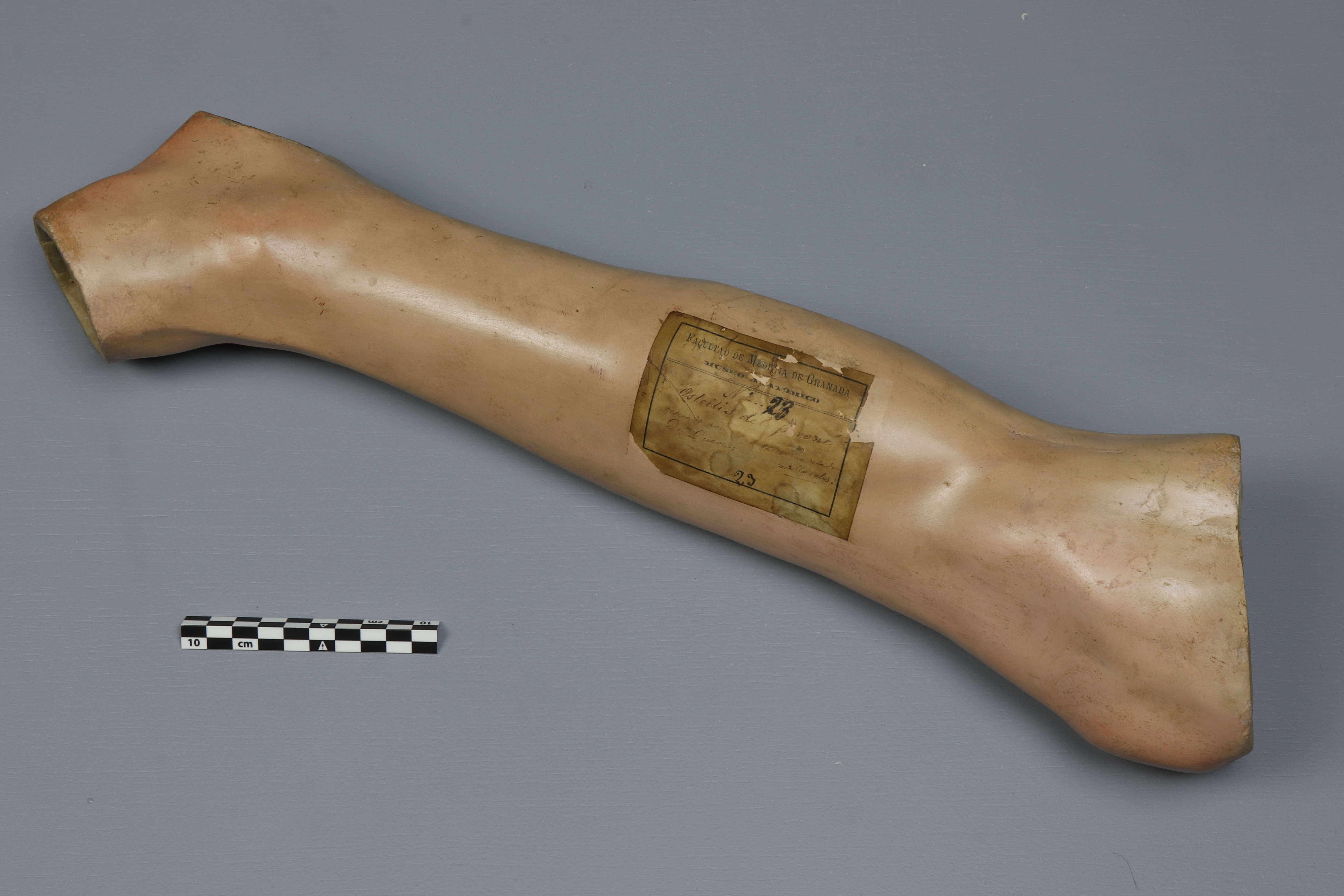 Molde en barro de la cara externa de rodilla, pierna y tercio medio del pie izquierdos con lesiones deformantes ocasionadas por una osteítis o proceso inflamatorio del hueso, concretamente del peroné. Presenta etiquetado con referencia al Museo Anatómico en el que consta la numeración (nº23), diagnóstico, médico tratante (Dr. Duarte) y autor de la escultura (Morales).