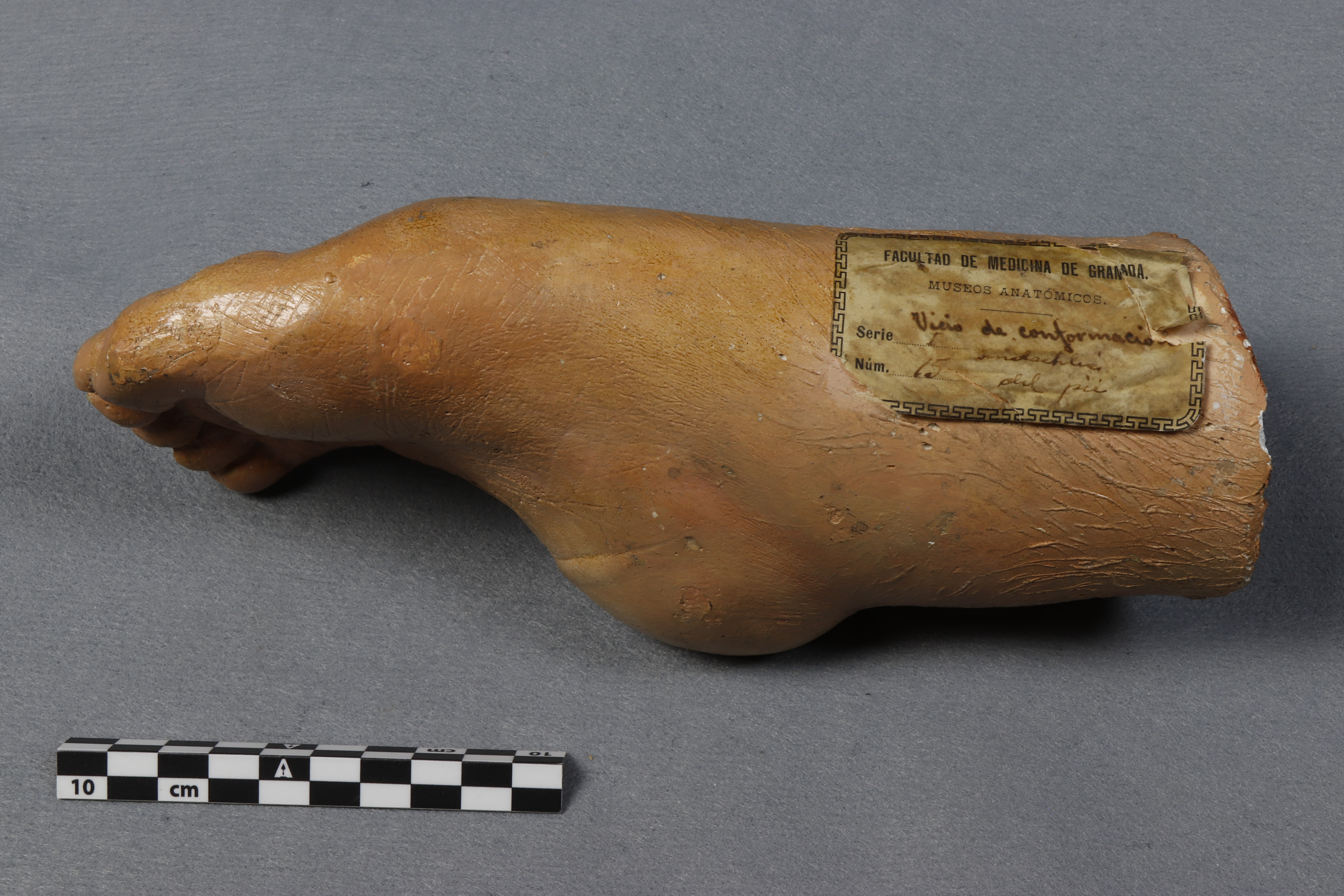 Molde de barro de un pie derecho en equino con sindactilia (fusión de los dedos). Presenta el etiquetado original del Museo Anatómico con diagnóstico y numeración (nº15)