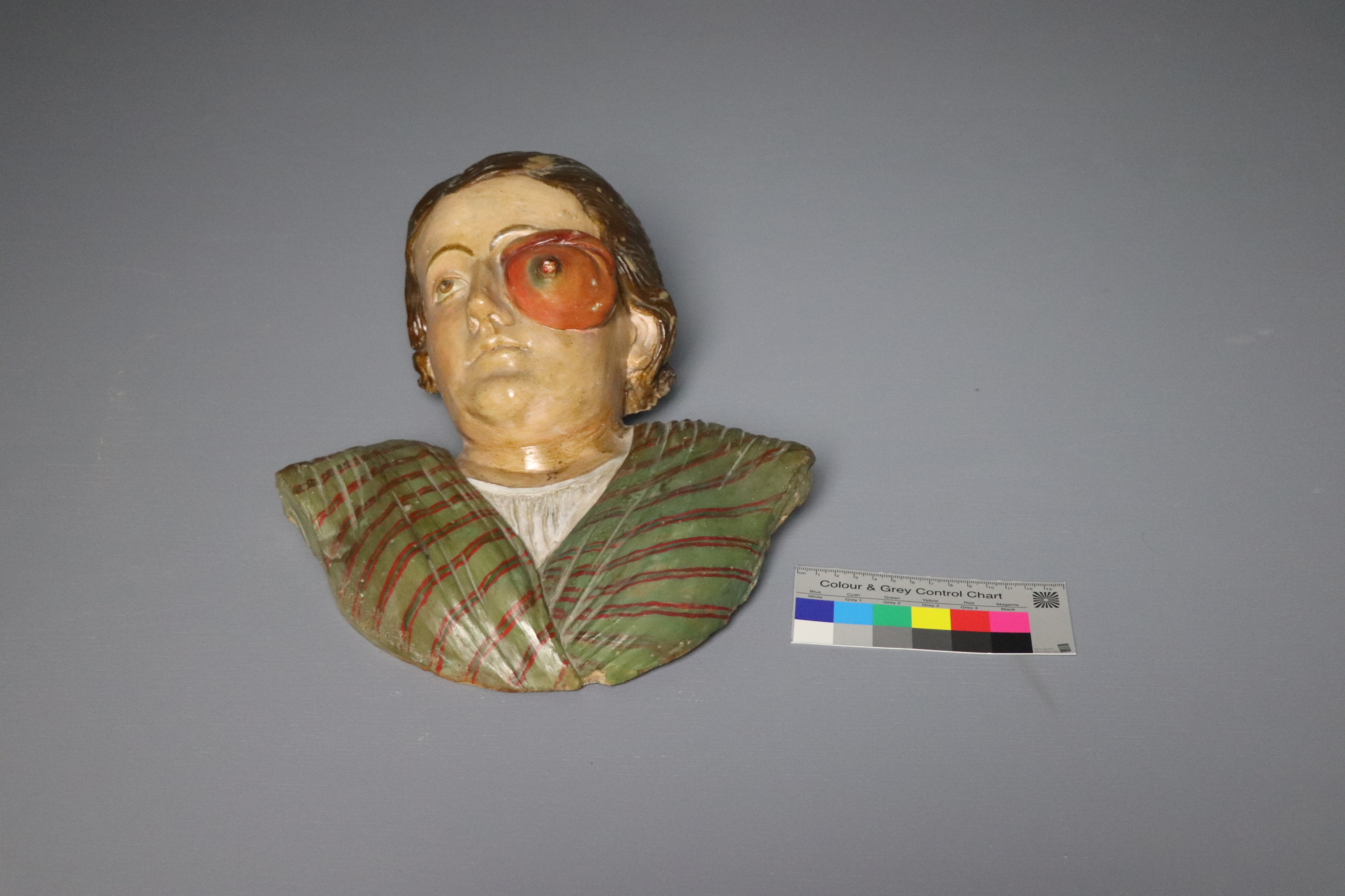 Modelo facial femenino con gran tumoración rojiza en el lado derecho de la cara que alcanza la región ocular.