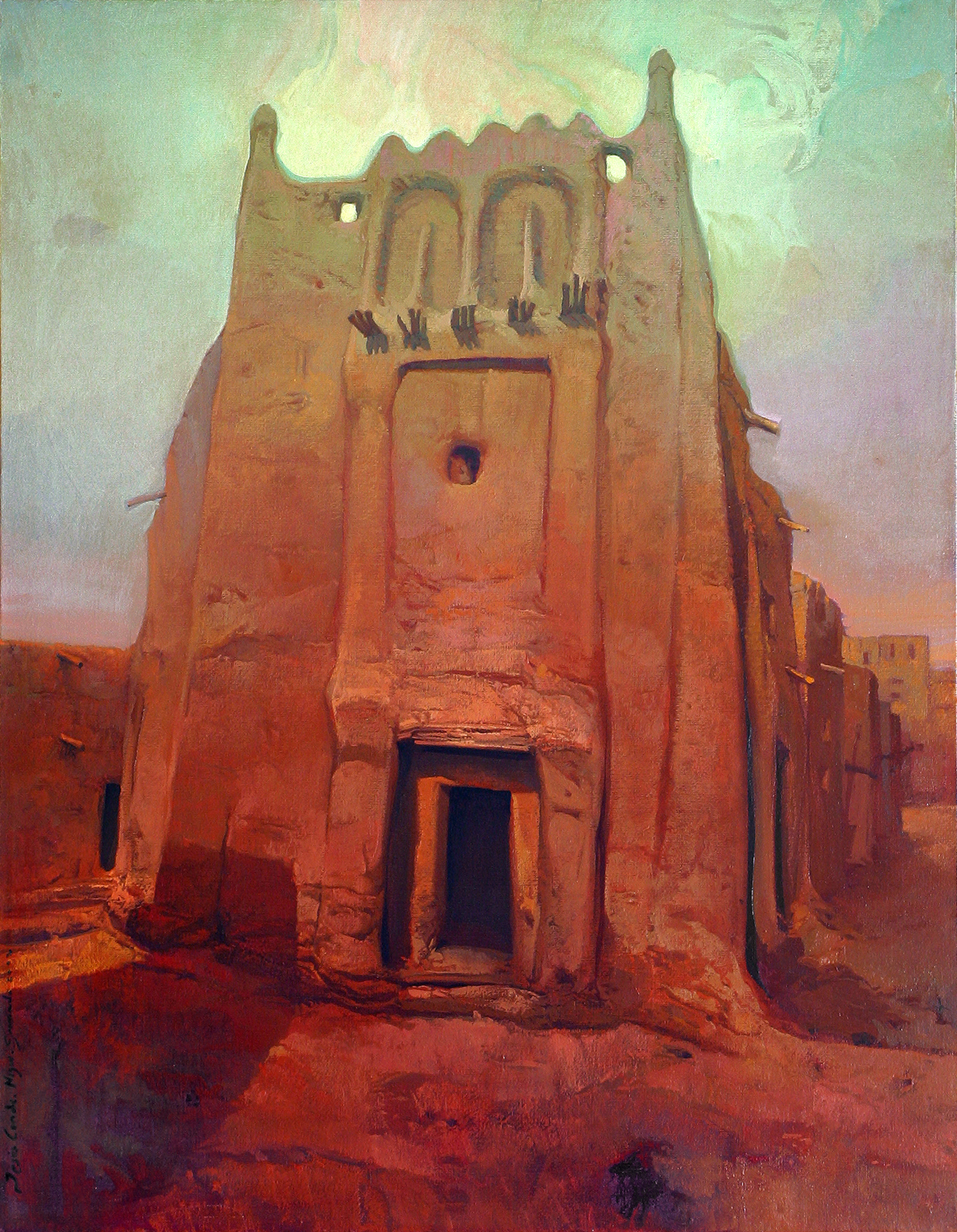 Cromáticamente, los tonos siena y rojizos de la tierra y las edificaciones recrean a la perfección las texturas del adobe y contrastan con un cielo en el que se entremezclan los morados, azules, verdes y amarillos pastel, recreando un ambiente denso y caluroso, pesado, propio de los territorios centroafricanos, donde el dintel abierto, sin puerta, parece ofrecer un oasis de frescor al viajero.