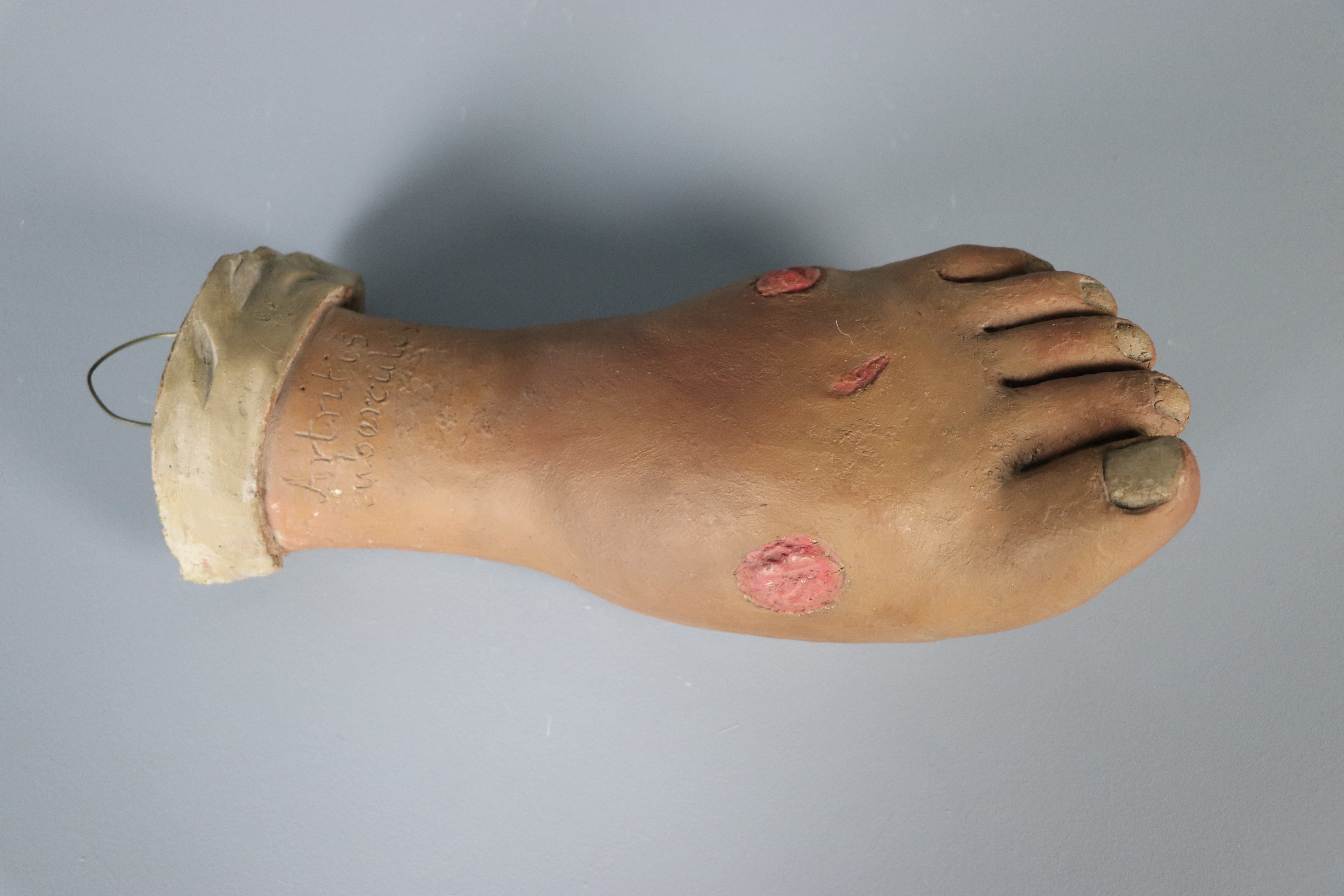 Modelo en barro de pie izquierdo tumefacto con tres granulomas diseminados por su cara dorsal. Sin etiquetar, indica el diagnóstico con letras impresas en el molde (artritis tuberculosa)