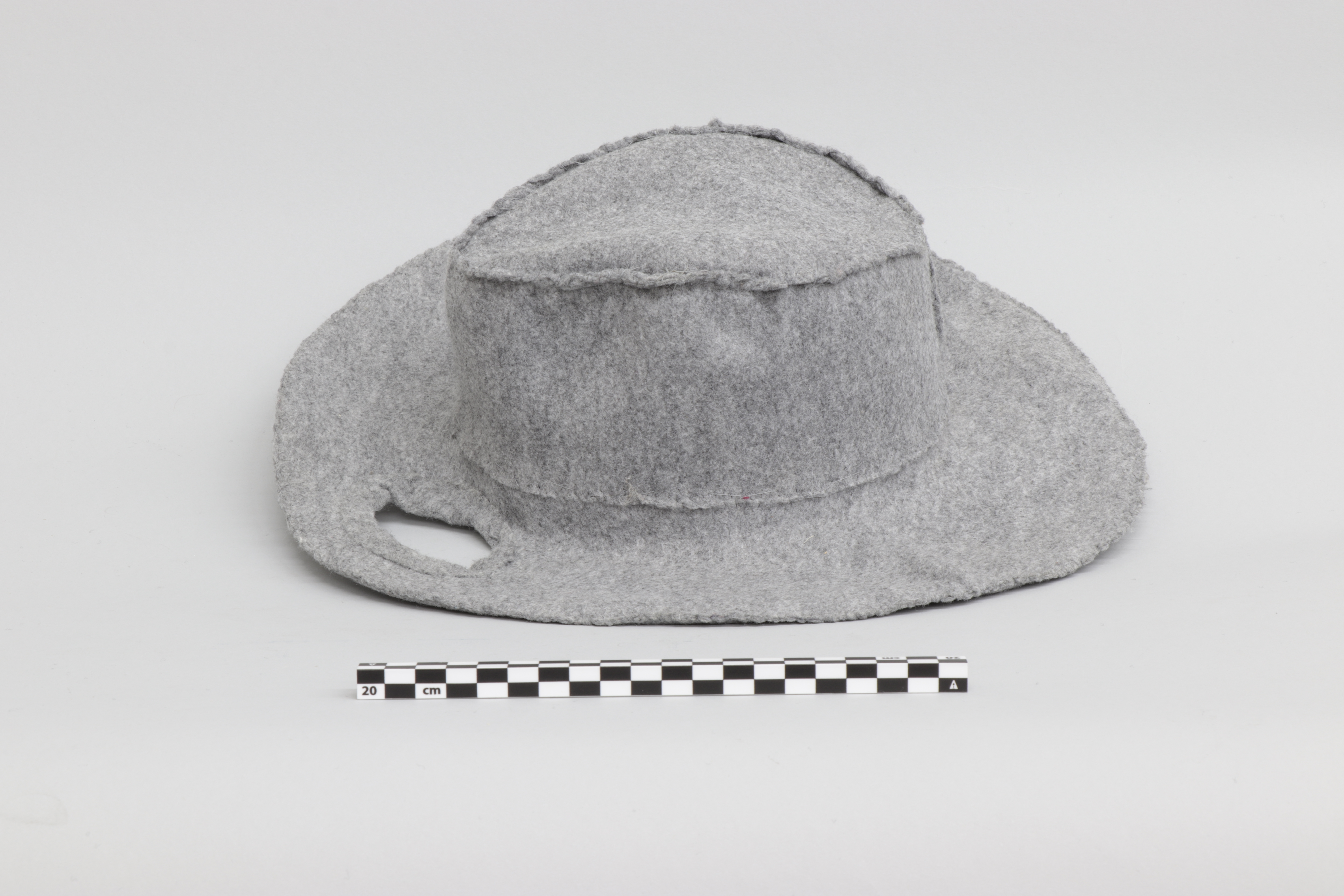 Sombrero de caña forrado de fieltro gris, una pieza tridimensional que se encuadra en un estilo objetual en donde prima la simplicidad del objeto cotidiano engalanado por la tela que lo cubre. En la solapa presenta un orificio probablemente causado por su uso anterior a haberse convertido el objeto en obra de arte conceptual, de manera que se trata de una pieza que nos evoca al pasado y los recuerdos que éste encierra.
