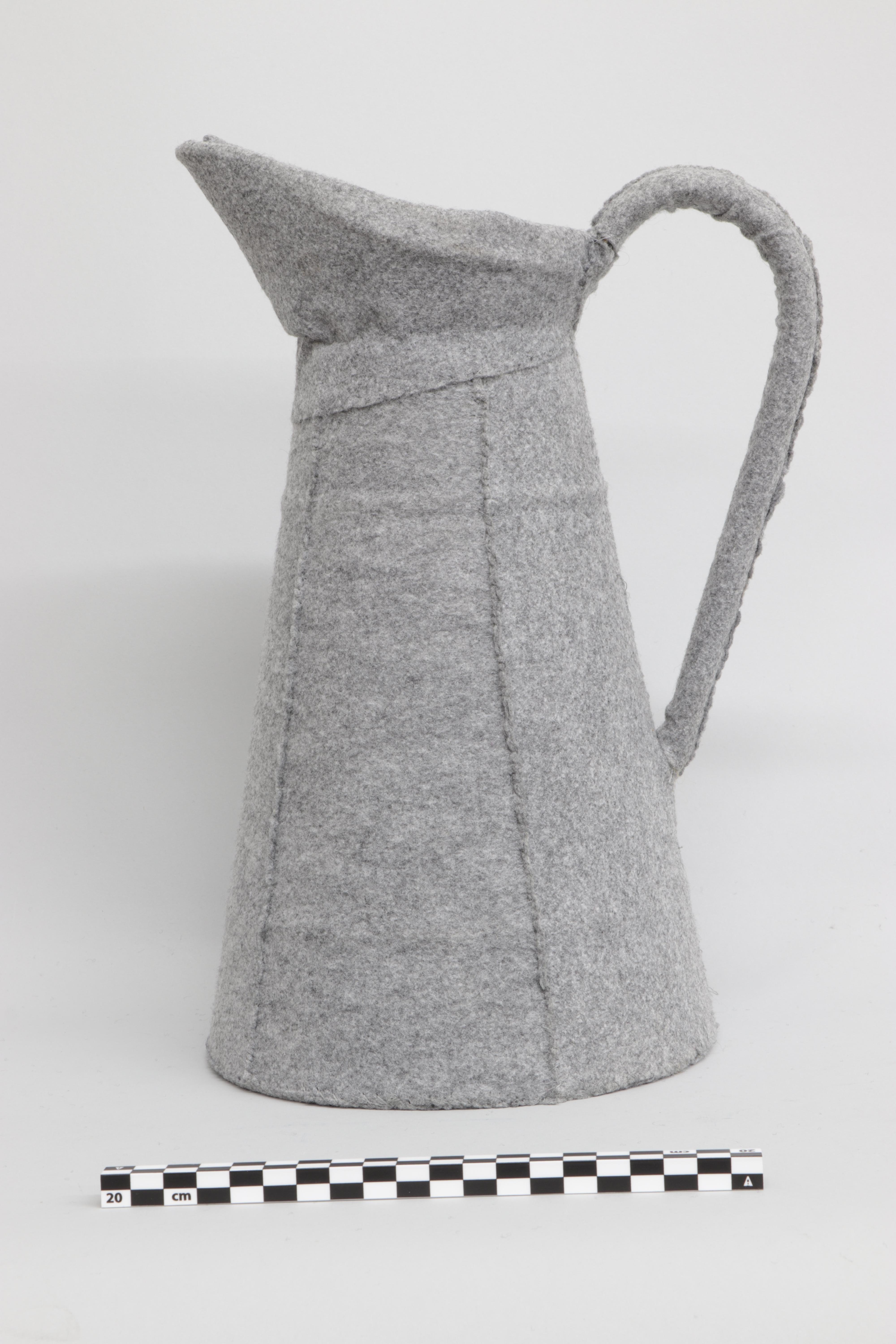 Jarra alta de boca ancha, de forma troncocónica creciente hacia la base y asa larga. La pieza está fabricada a base de peltre (aleación de cinc, plomo y estaño) esmaltado y vitrificado, y presenta un revestimiento textil de fieltro gris.