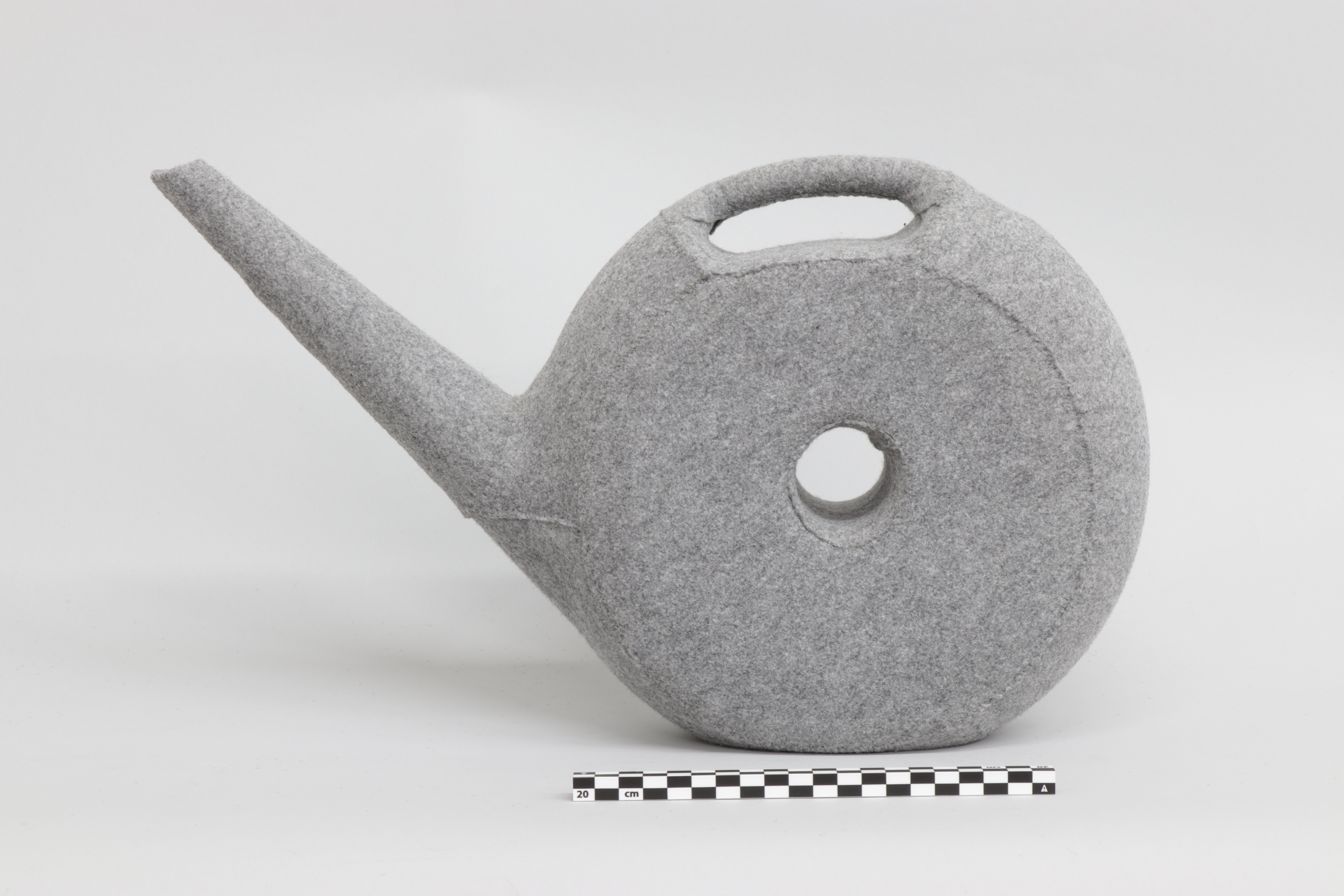 Esta pieza es un recipiente portátil que puede ser llenado de agua para regar las plantas. Concretamente es del tipo que tiene un tubo con un solo agujero por el que sale el líquido. Es de aspecto redondo con un asa pequeña en la parte superior de la esfera y un orificio en la parte central. Se presenta con un revestimiento textil en fieltro, lo cual le aporta la transformación de objeto cotidiano a pieza artística.