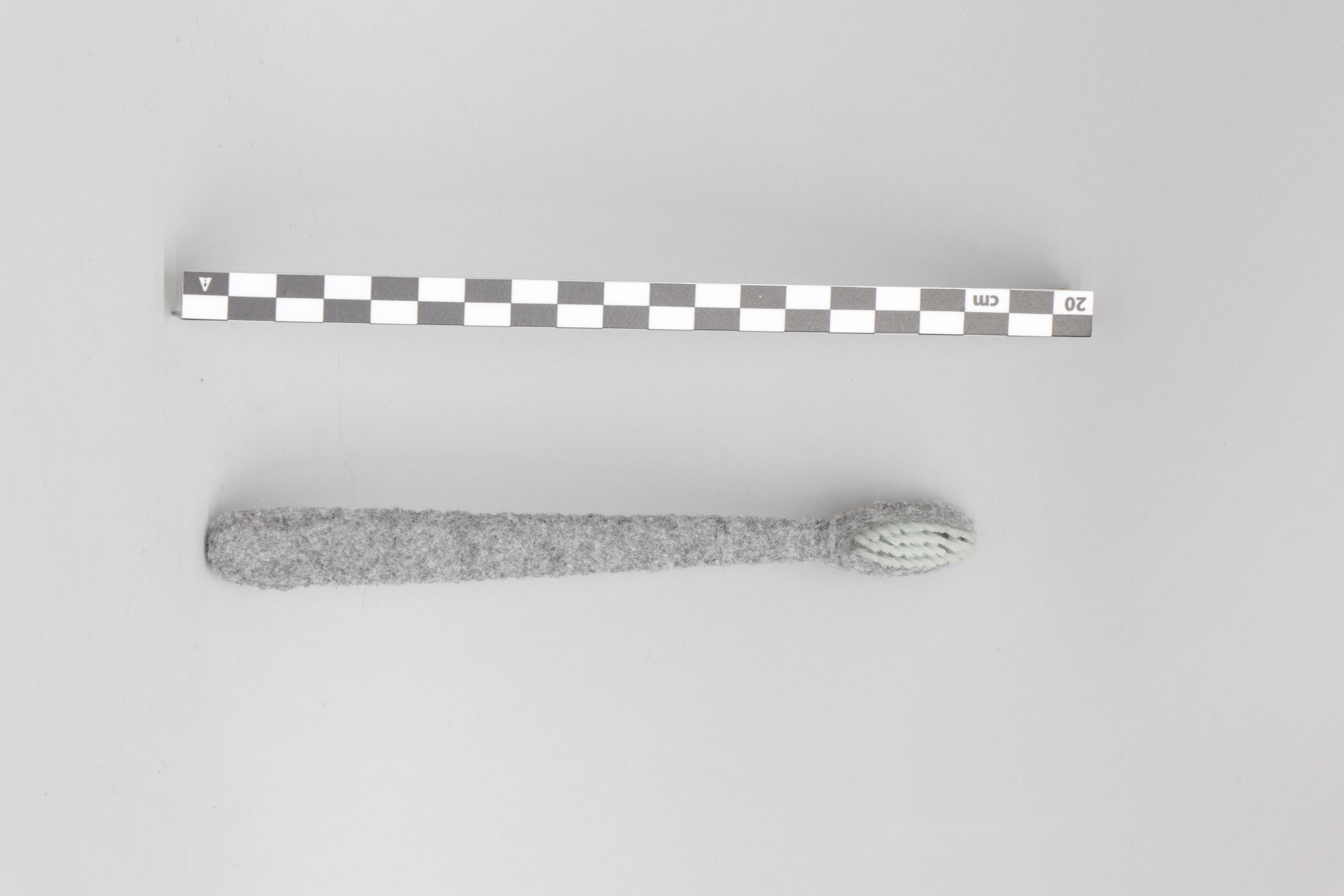 Esta pieza es un objeto de uso cotidiano conocido por todos como cepillo de dientes manual. El artista lo ha transformado en una pieza artística conceptual que encierra recuerdos u emociones gracias al revestimiento textil en fieltro gris que evoca al pasado.