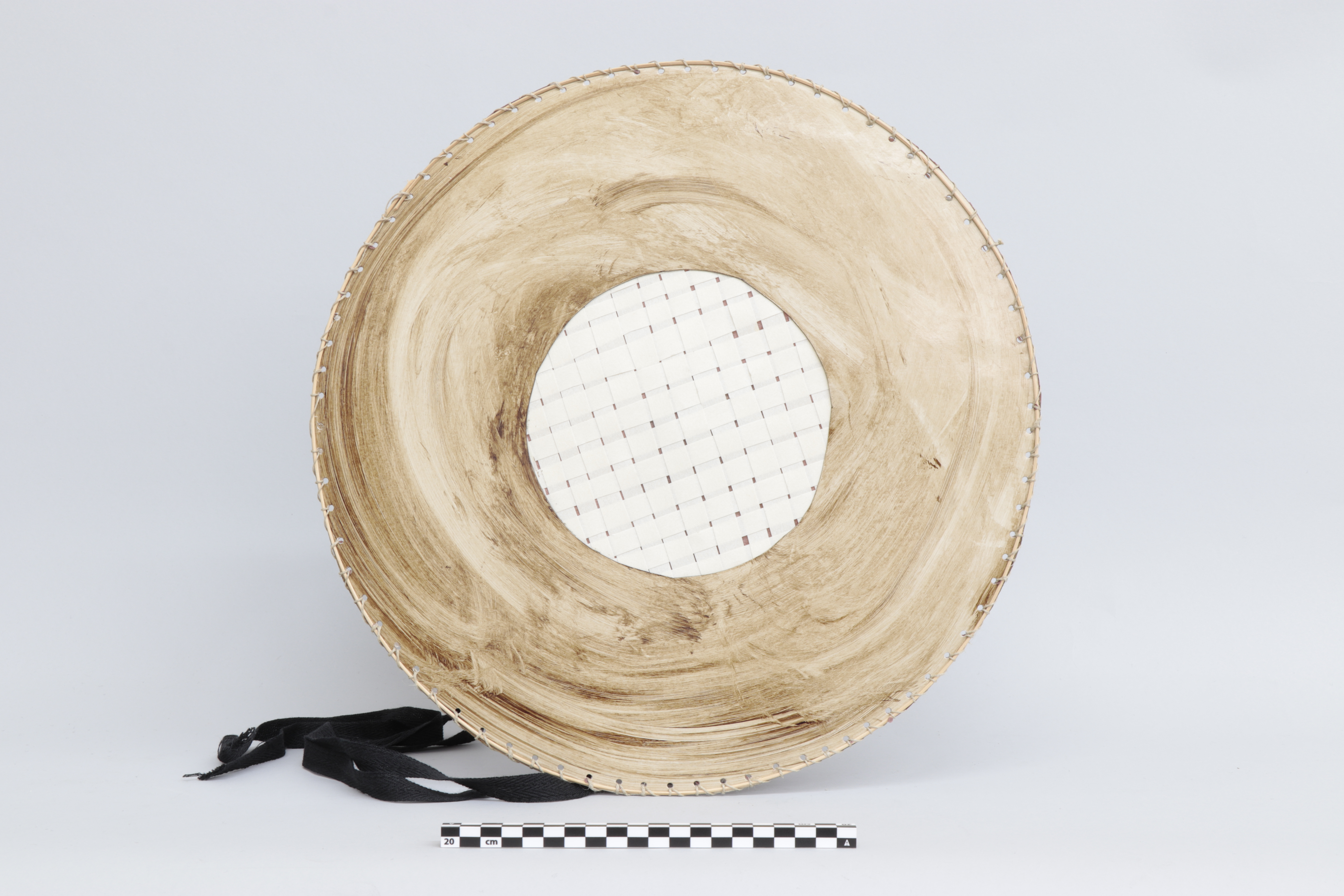 Sombrero plano. Por una cara presenta una trama de trenzado en la zona central con el material de su composición a la vista, y toda la parte externa (lo que seria la solapa) en su conjunto esta pintada con alguna pátina que le confiere un aspecto a madera envejecida. Por la cara trasera se añade un papel seda que hace las veces de forro del sombrero. Además, en la parte interior tiene un lazo negro que sirve la la sujeción del sobrero a la cabeza. Además, tiene todo el diámetro de la pieza cosido con hilo de rafia o semejante.