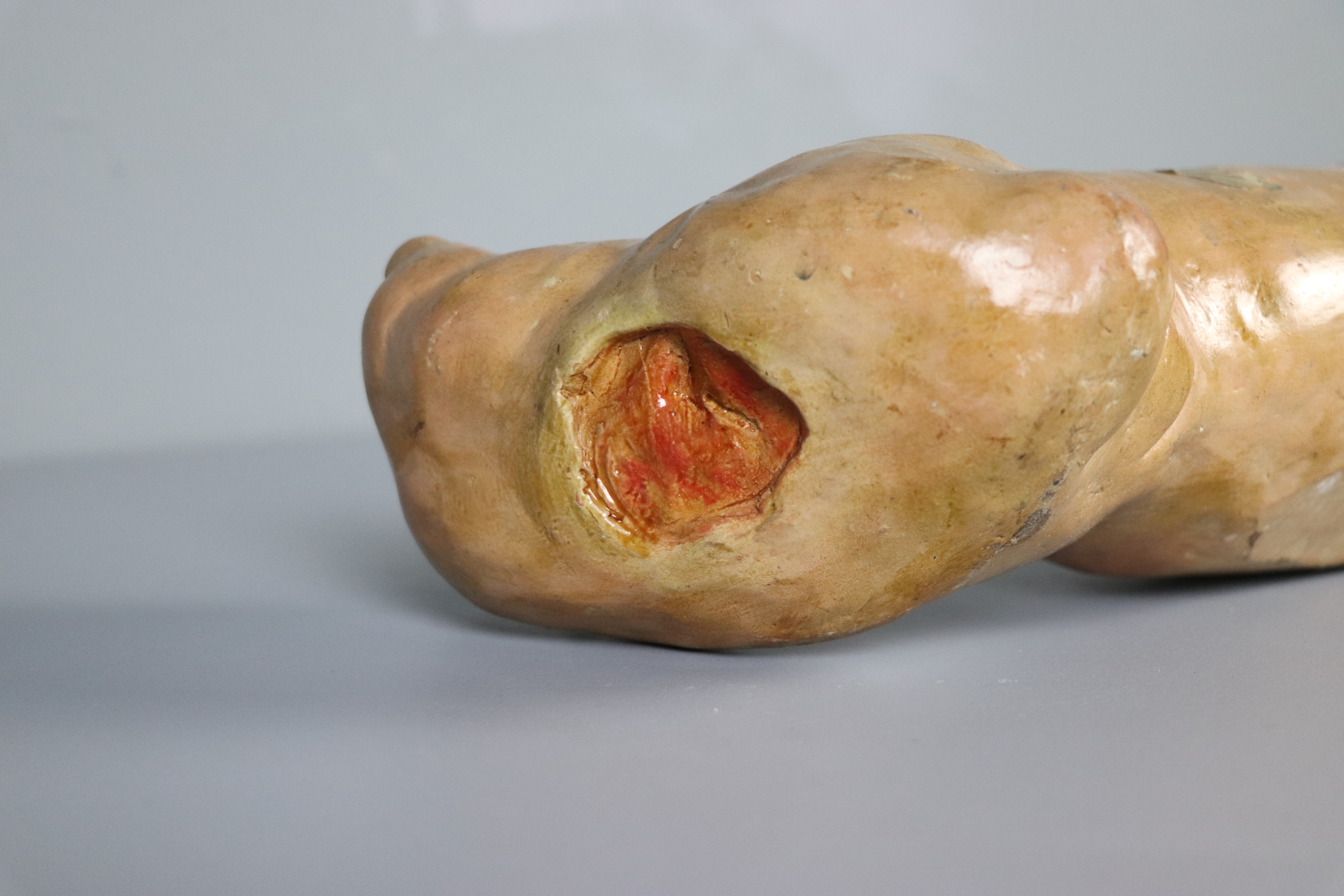 Modelo en barro de rodilla, pierna y pie derechos con úlcera plantar circunscrita, de bordes callosos, de gran tamaño y coloración rojiza, adyacente al talón y con destrucción de la piel que alcanza planos profundos. Esta lesión se encuentra acompañada de otras deformidades del pie. Etiqueta original del Museo Anatómico con diagnóstico y numeración originales (nº. 39)