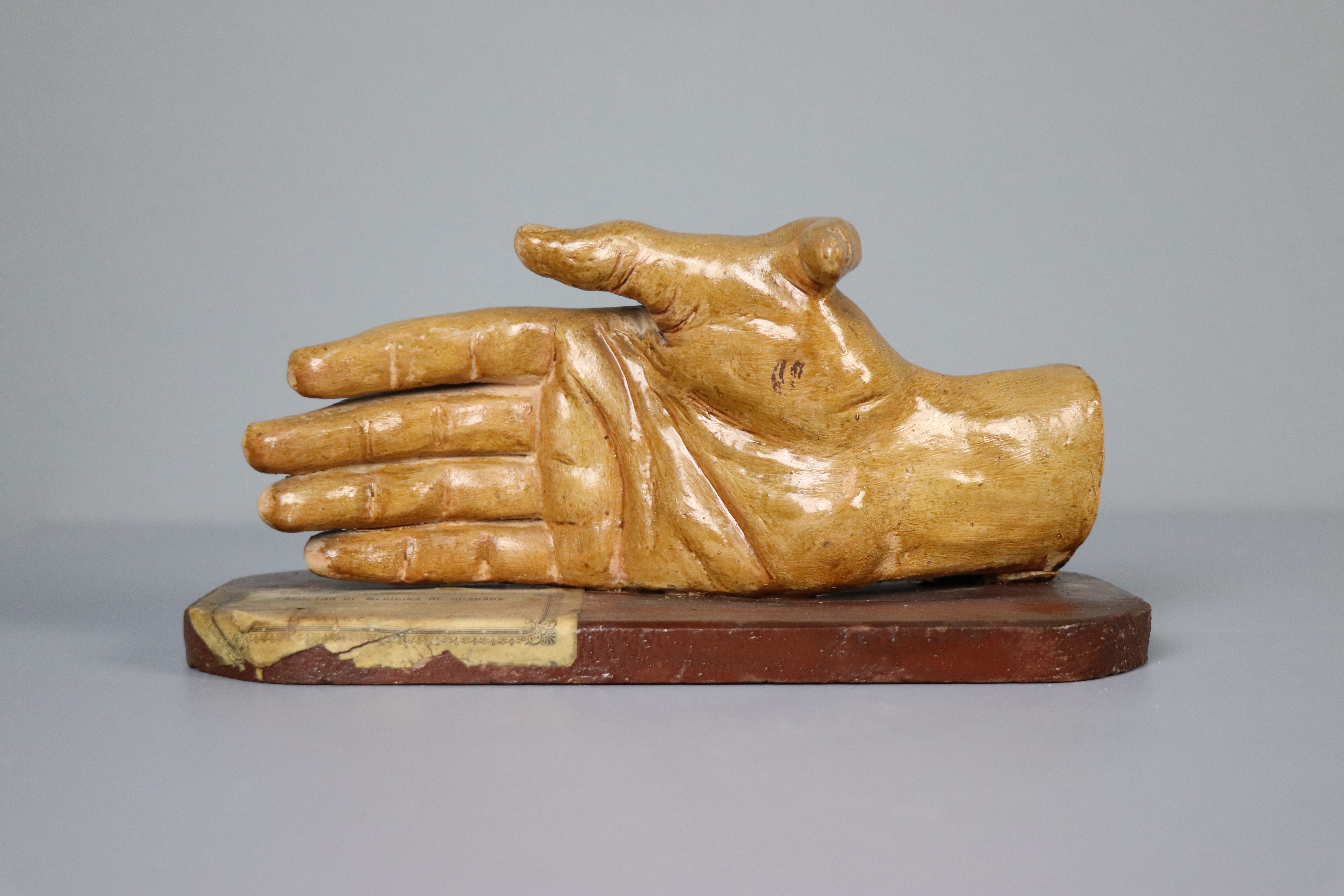 Modelo en barro sobre peana de madera que representa una mano derecha con un dedo supernumerario de pequeño tamaño situado en el borde radial del 1º metacarpiano. Presenta etiqueta identificativa del Museo Anatómico con diagnóstico y numeración originales (Serie I, n.º 2)