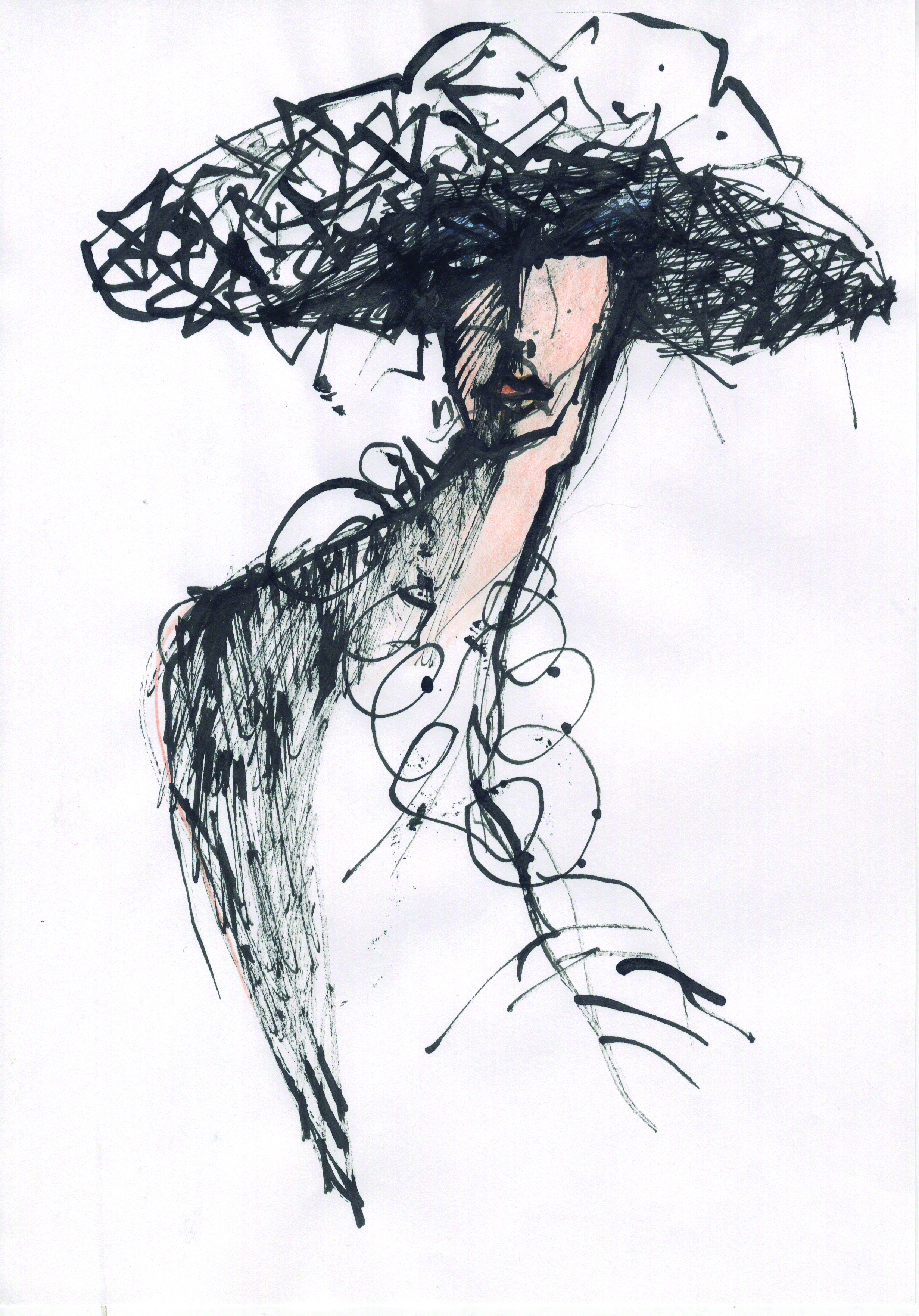 Lámina tamaño A4, en papel de folio sobre marco de cartulina. Diseño de moda femenino, destacando un gran sobrero creado a base de línea, sin ninguna mancha de color. Hay color naranja pastel en el rostro del personaje dibujado.