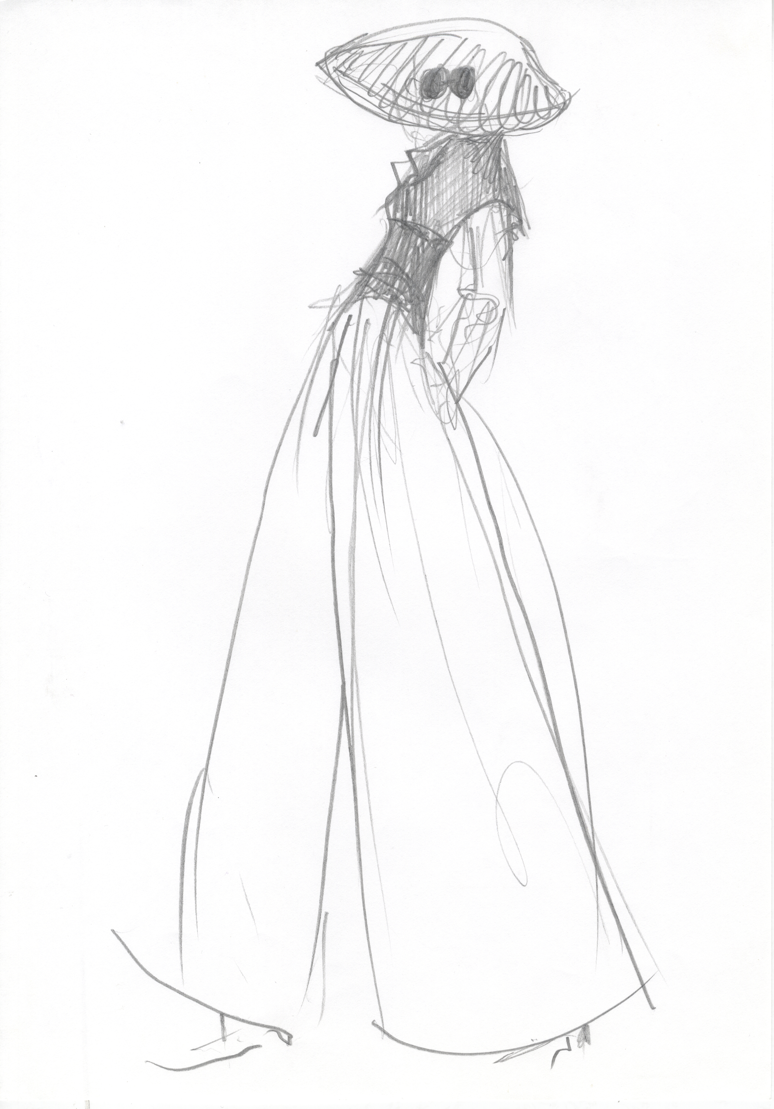 Dibujo realizado a lápiz de grafito sobre papel que representa un diseño de moda femenino en el que destaca una camisa oscura ajustada a la parte inferior del torso con una especie de corpiño y pantalón de pernil muy ancho. Además la modelo está tocada por un sombrero de gran tamaño que le oculta la cara aunque permite distinguir unas gafas de cristales redondos y oscuros.