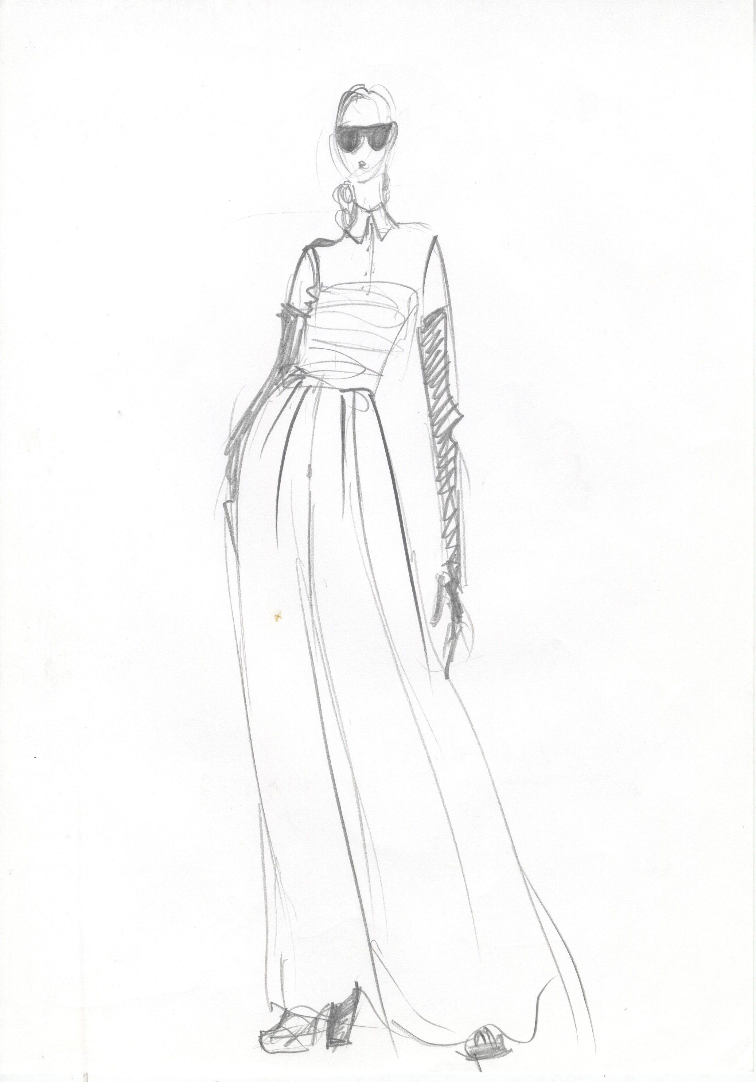 Dibujo realizado a lápiz que representa un diseño de moda femenino, dos piezas: camisa manga a la sisa y pantalón de pernera ancha y tiro alto. Además este diseño posee guantes altos 3/4, gafas de sol y zapatos de tacón.