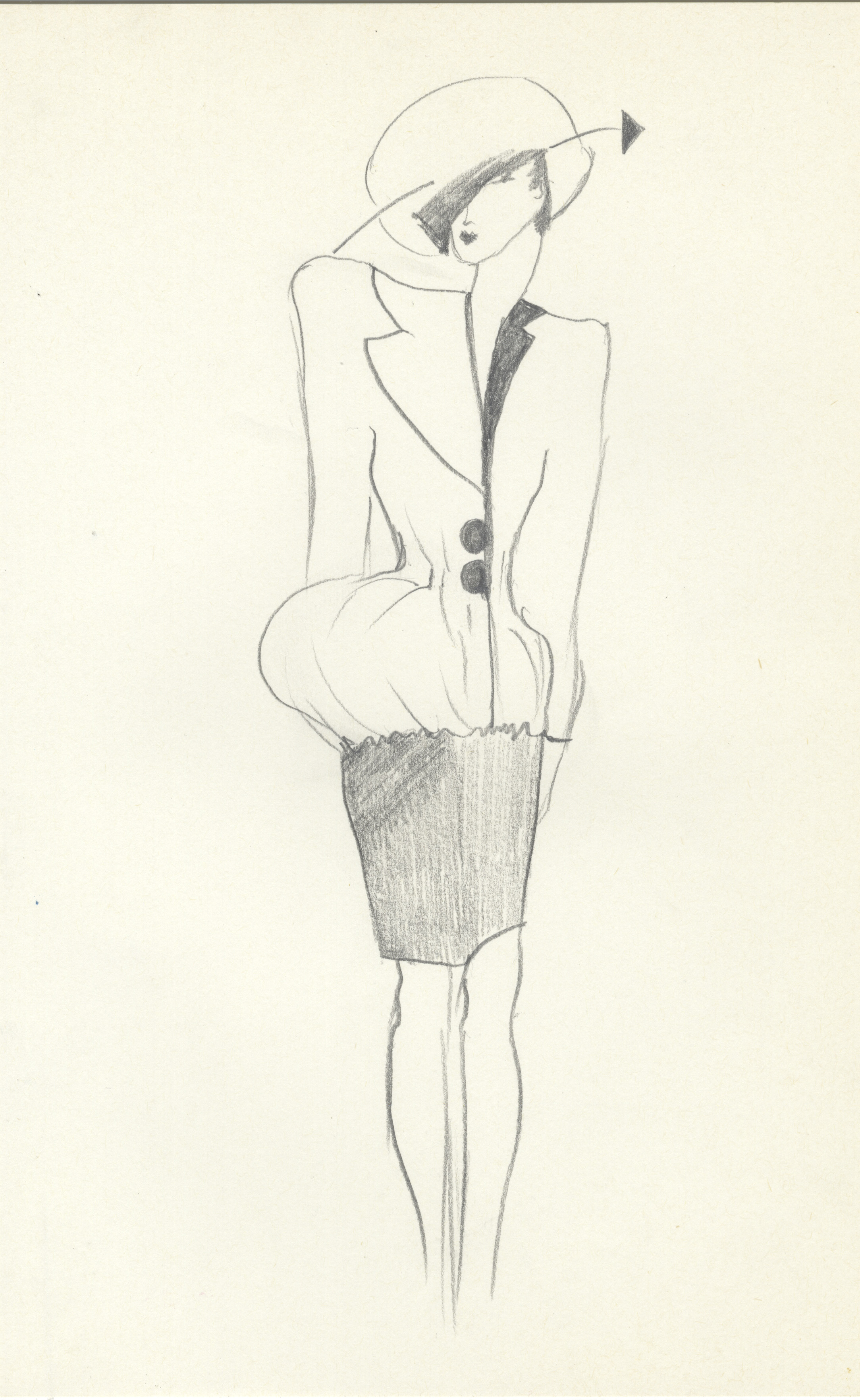Dibujo esquemático a lápiz en el que se representa un figurín femenino vestido con falda oscura de largo sobre la rodilla y chaqueta americana de corte femenino, ceñido a la cintura y con botonadura simple en el centro. El atuendo se completa con un sombrero de ala ancha y copa redondeada, que aparece esbozado pero tiene gran presencia en el dibujo.