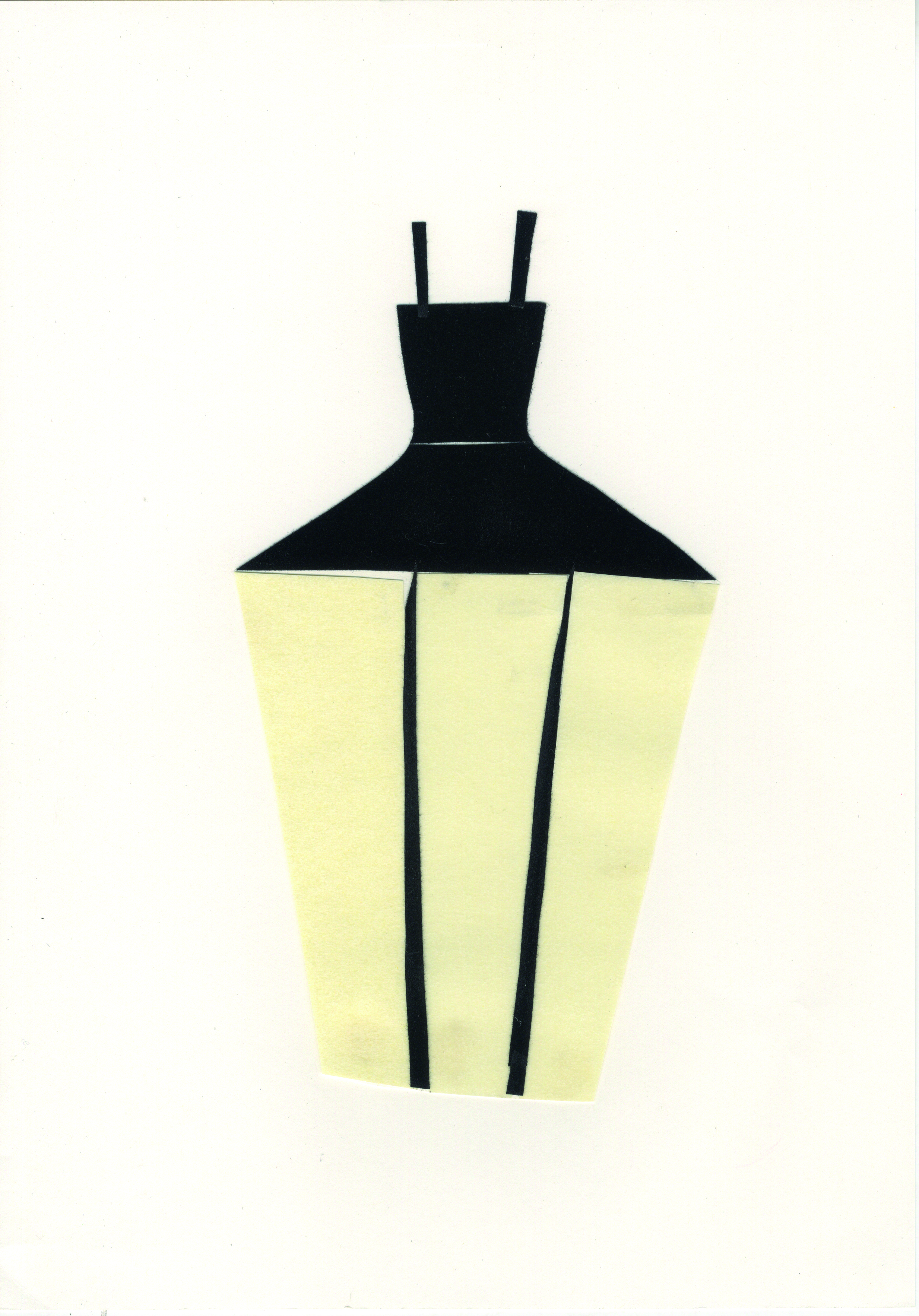 Collage para diseño de un vestido, realizado en papel adhesivo de fieltro para las secciones negras y cartulina para las beige. En la elaboración de la estructura del vestido hace uso de un corpiño de tirantes ceñido al cuerpo para abrir amplitud en la cadera.