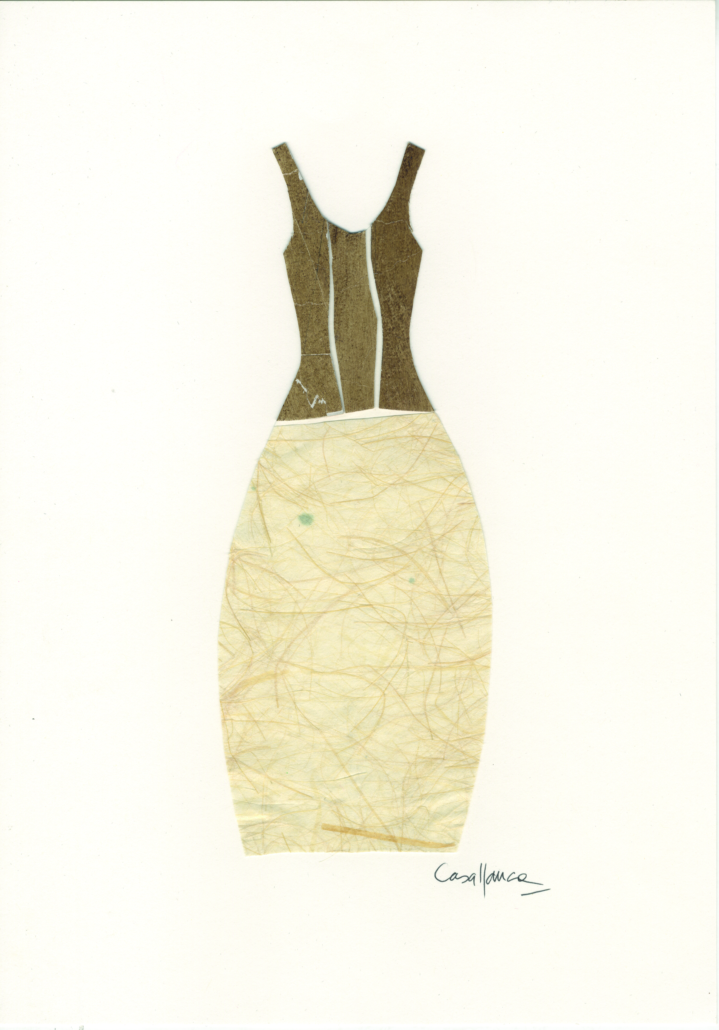 Diseño de moda realizado mediante la técnica del collage. Vestido formado por una falda globo de papel artesanal con textura y corpiño de tirantes finos y amplio escote ovalado, compuesto por tres secciones verticales de cartón marrón, pegadas manteniendo una distancia mínima entre ellas, pero suficiente para insinuar la presencia de ballestas o costadillos.