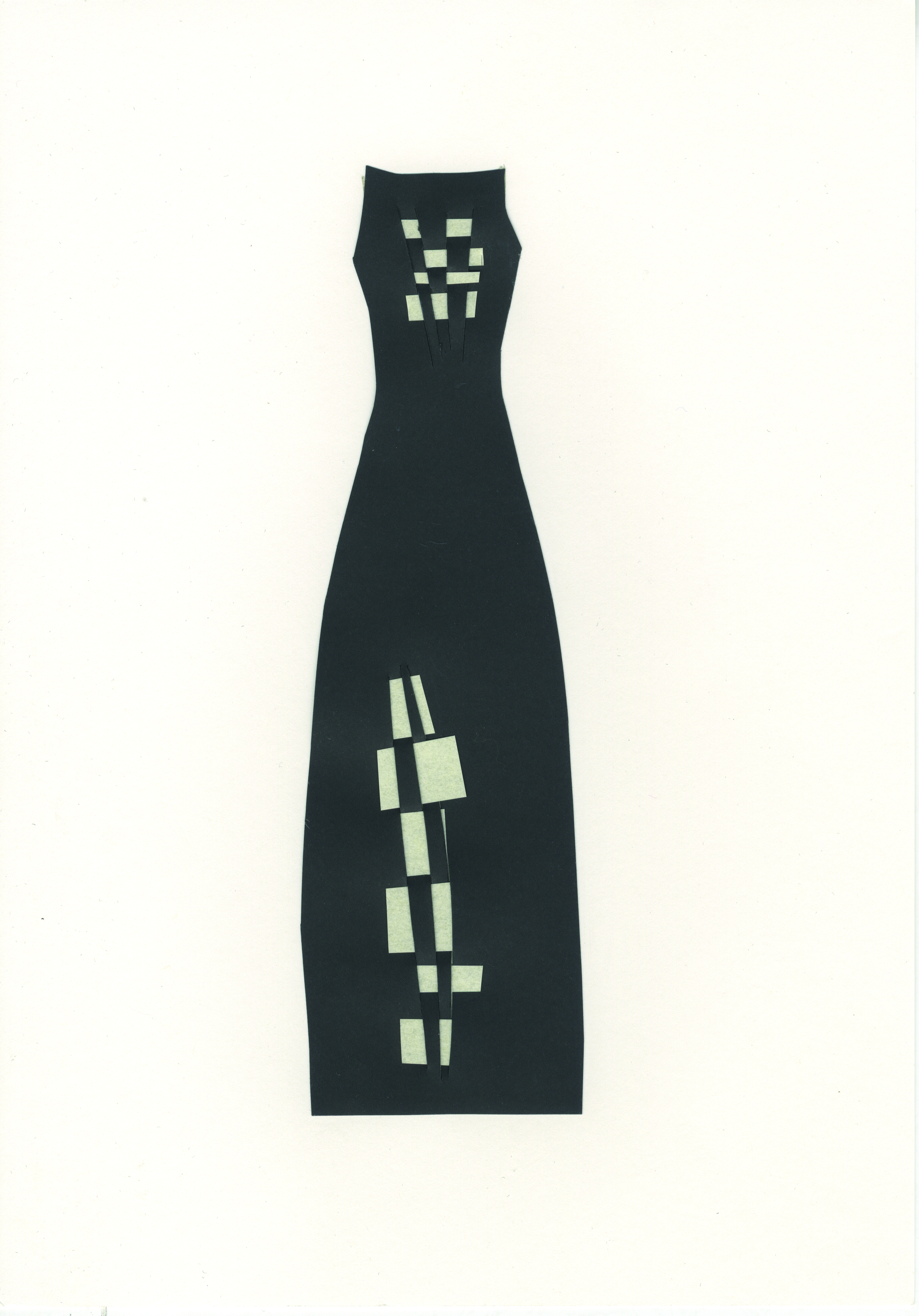 Diseño de moda realizado siguiendo la técnica del collage. Vestido largo en una pieza, recortado en cartulina negra que se decora con notas blancas mediante la inserción de piezas de papel blanco en las aberturas verticales practicadas en la cartulina.