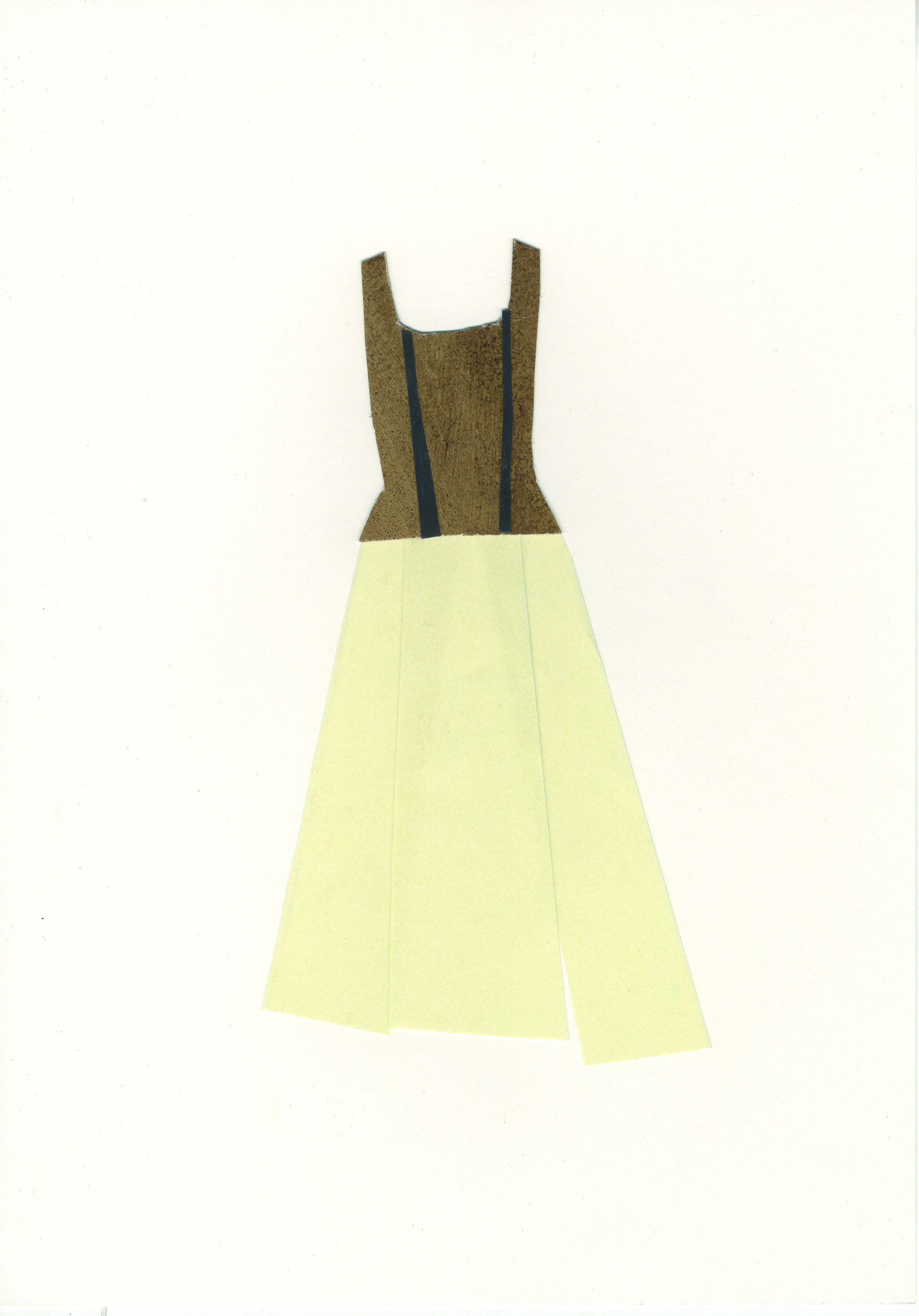 Diseño de moda realizado mediante la técnica del collage. Vestido formado por  falda de papel color marfil y corpiño realizado en tres secciones verticales de cartón marrón con dos tiras de cartulina verticales a modo de decoración, separando lo que podrían ser costadillos o ballenas del corpiño.