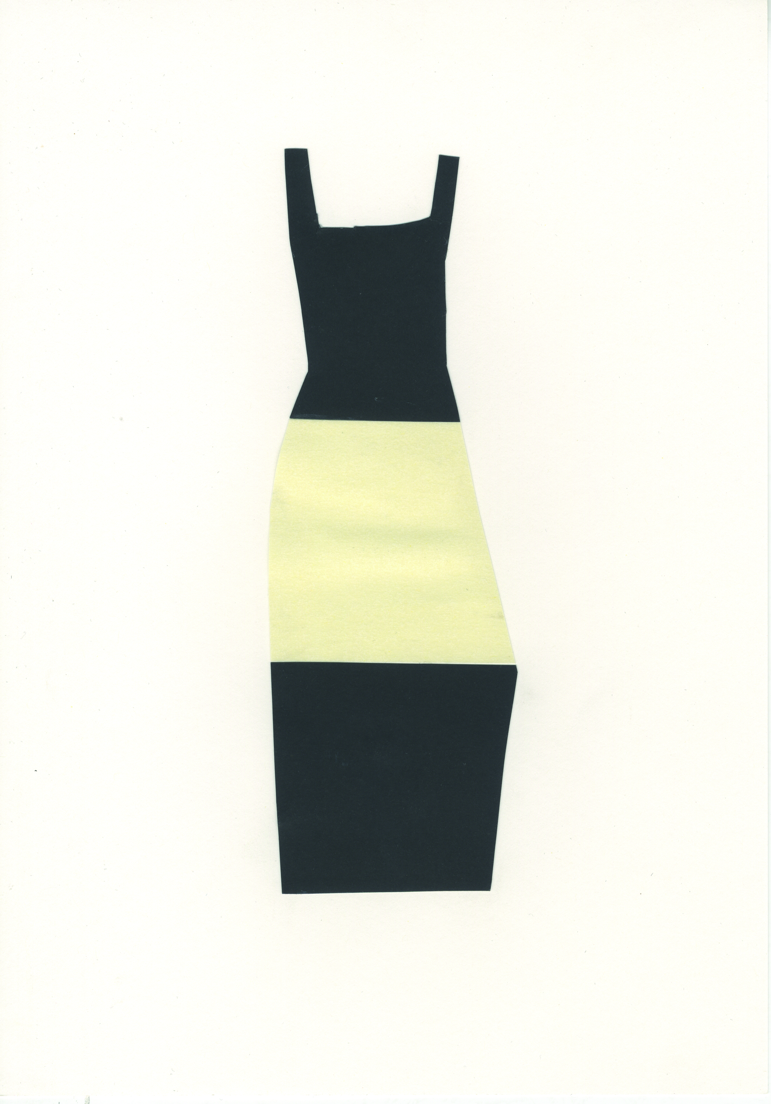 Diseño de moda realizado mediante la técnica del collage. Representa un vestido largo de tirantes y escote cuadrado, realizado en dos piezas de cartulina negra que se conectan desde la altura de la cadera hasta la rodilla por una franja de papel beige claro.