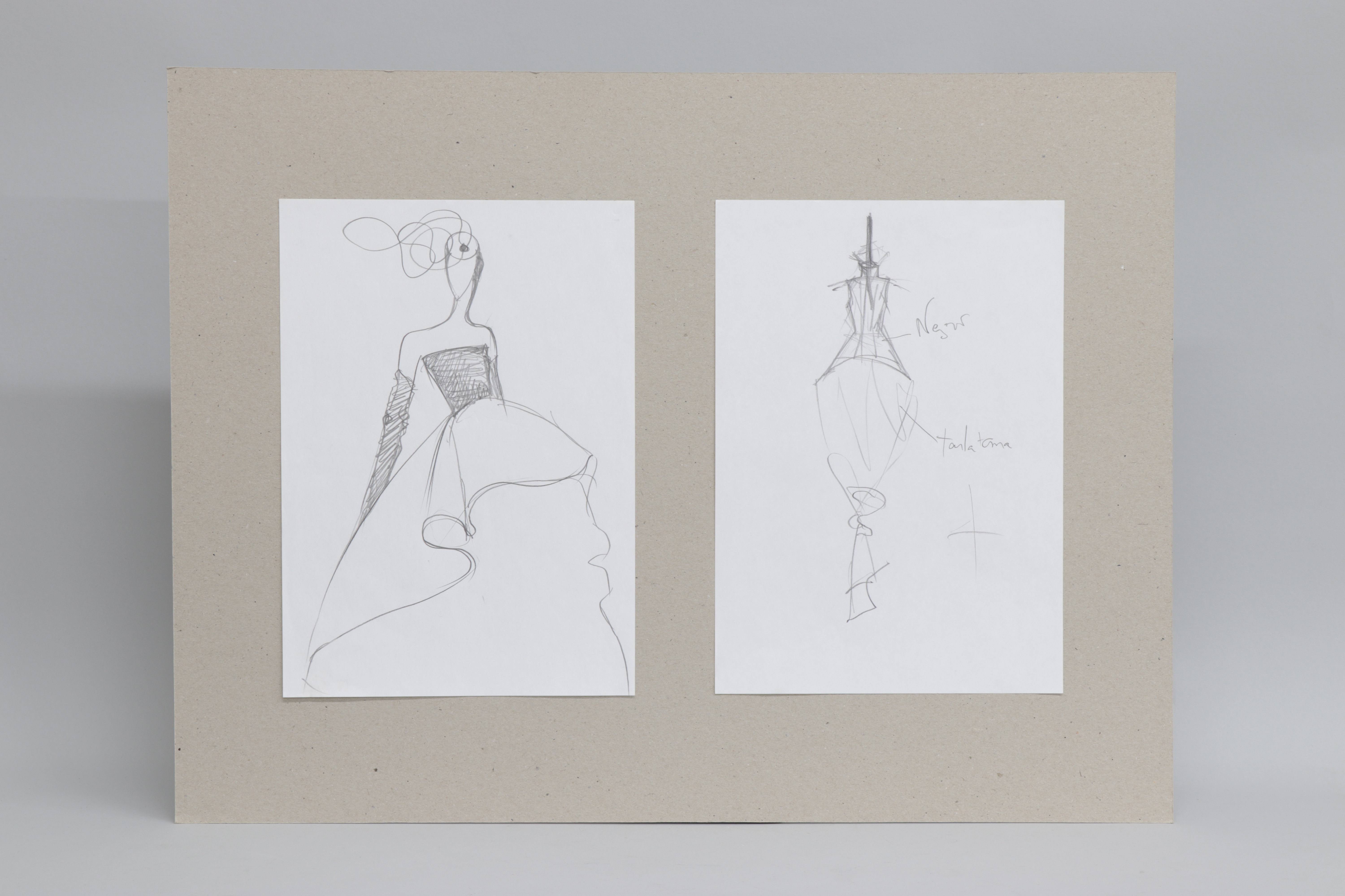 Cartón compuesto por dos dibujos en papel blanco A4. Ambos representan un patrón o diseño de moda. Figurín sin rostro utilizado exclusivamente como soporte para crear el diseño de moda.