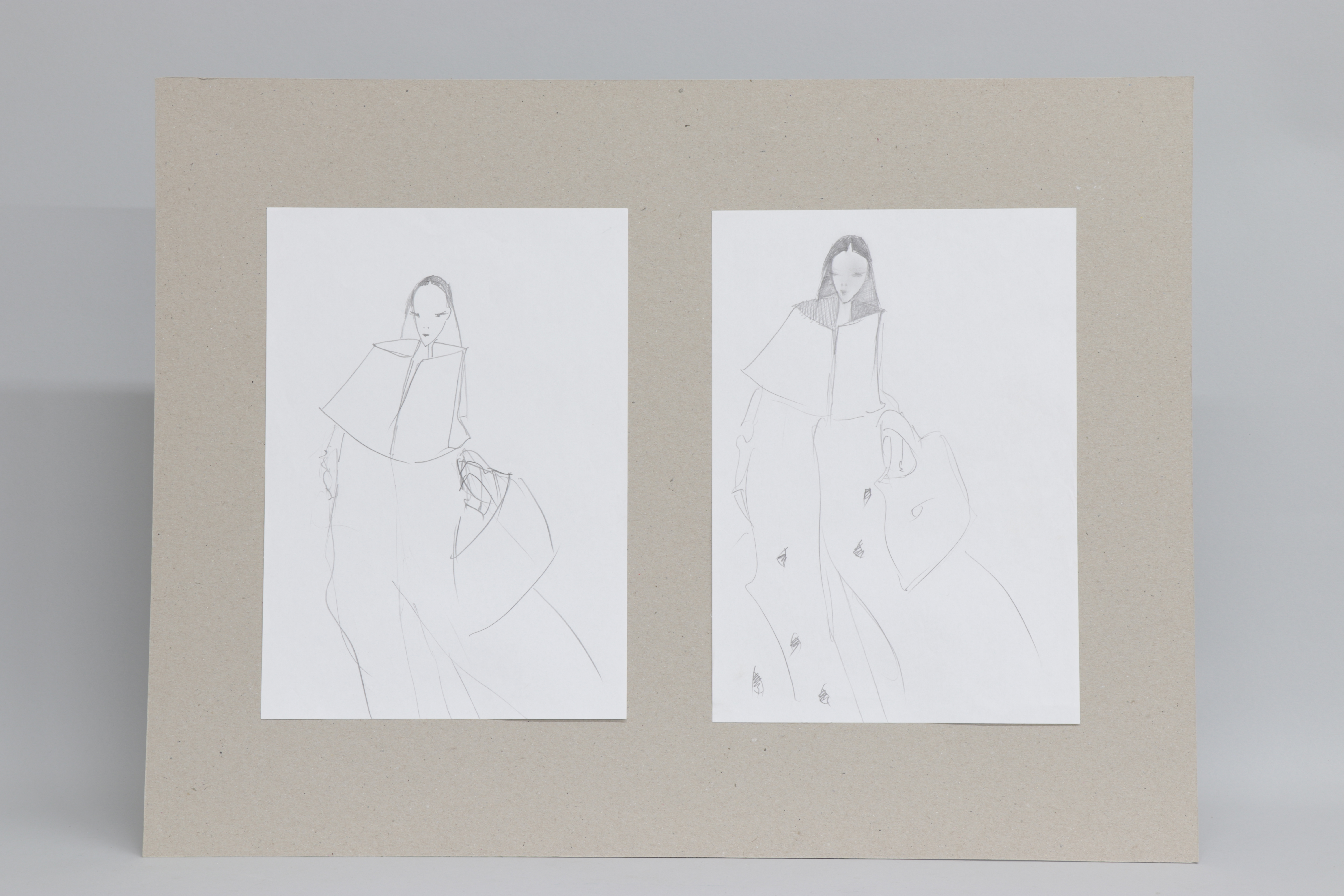 Cartón compuesto por dos dibujos en papel blanco A4. Ambos representan diseños de moda muy abocetados utilizando un figurín. Único ejemplo de la serie en el que el artista se detiene en los ojos y boca del rostro femenino. Los dos bocetos recrean un mismo abrigo con cuello chimenea y abertura central, complementado con un bolso.