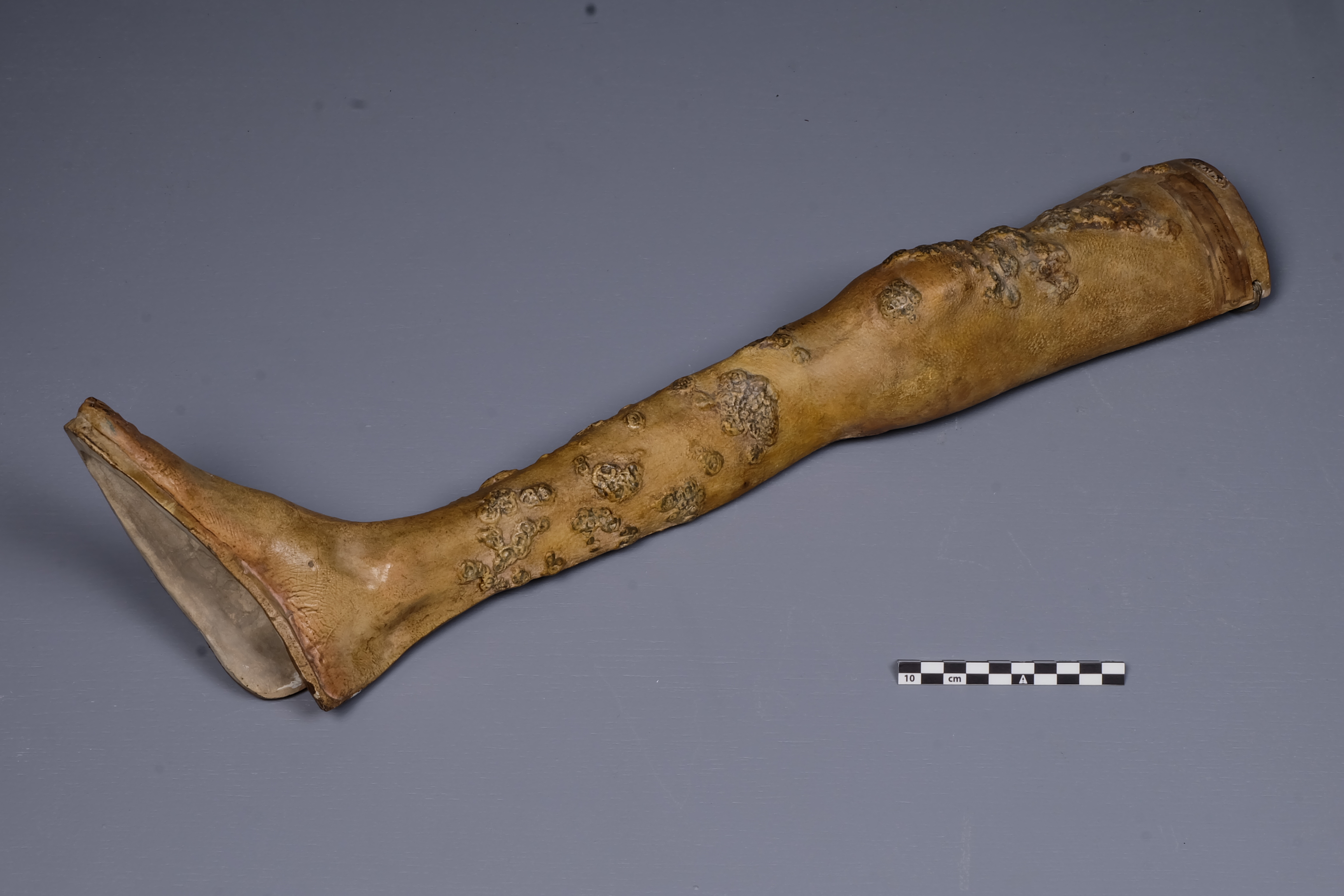 Molde en barro de pierna, pie y muslo derechos en posición frontal con lesiones pápulo-escamosas confluentes de coloración parduzca y tamaño variable e intensa atrofia muscular. Etiquetado original del Museo Anatómico, con el diagnóstico y el autor Porcelanosa Losada. En su cara externa, al igual que otras de las figuras del mismo autor, se encuentra una marca en relieve con la numeración (S5, n.º 3) y un sello en el interior en el que consta la procedencia (Valdemorillo), la fábrica de loza que lo produjo (Falcó y Cía) y el autor (Losada)