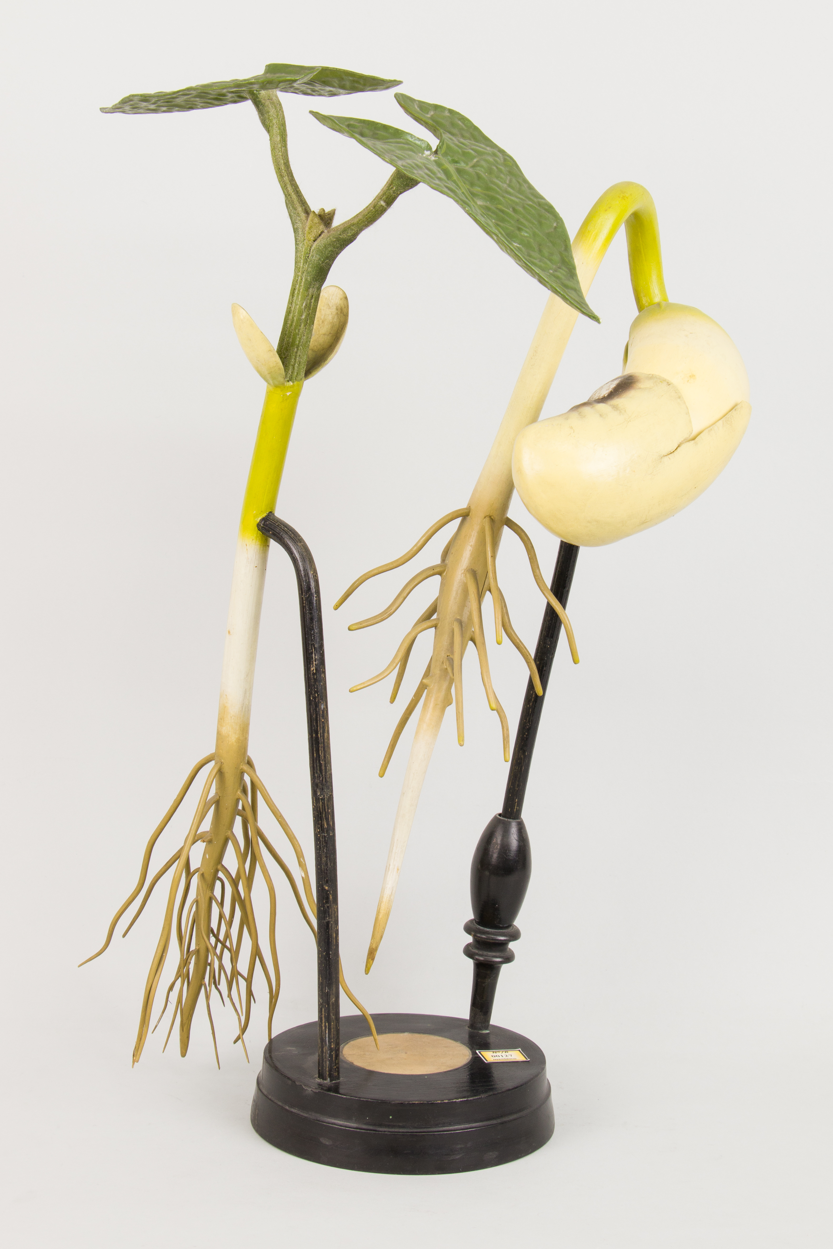 El modelo permite ver, ampliadas, dos fases de la germinación de una planta dicotiledónea, concretamente una leguminosa: una primera fase del proceso donde la cubierta que protege la legumbre se ha roto a causa de la presión de turgencia dejando paso a la salida del meristema apical de la raíz; por otro lado, nos muestra un estadio más avanzado de la germinación donde los cotiledones ya se han separado y se han formado las dos primeras hojas flanqueando el meristema apical del vástago.
