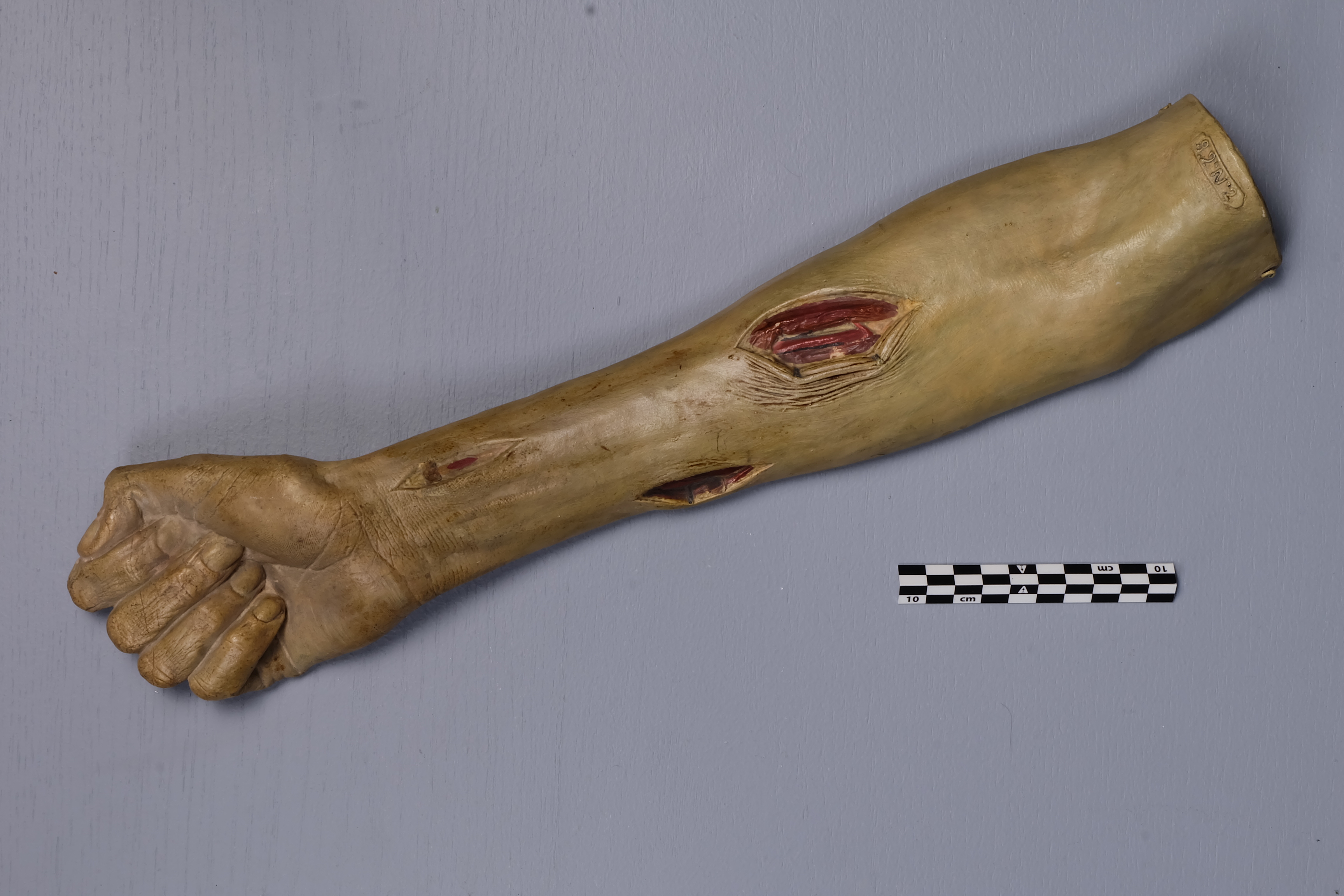 Molde en barro de cara ventral de antebrazo y mano derechos con tres incisiones anatomo-quirúrgicas, dos a nivel radial y una cubital. No etiquetada, aunque posee una inscripción en relieve en la cara externa con la numeración (ilegible en parte, S n.º 2) y un sello en el interior en el que consta la procedencia (Valdemorillo), lugar de fabricación (Falcó y Cía) y autor (Losada)