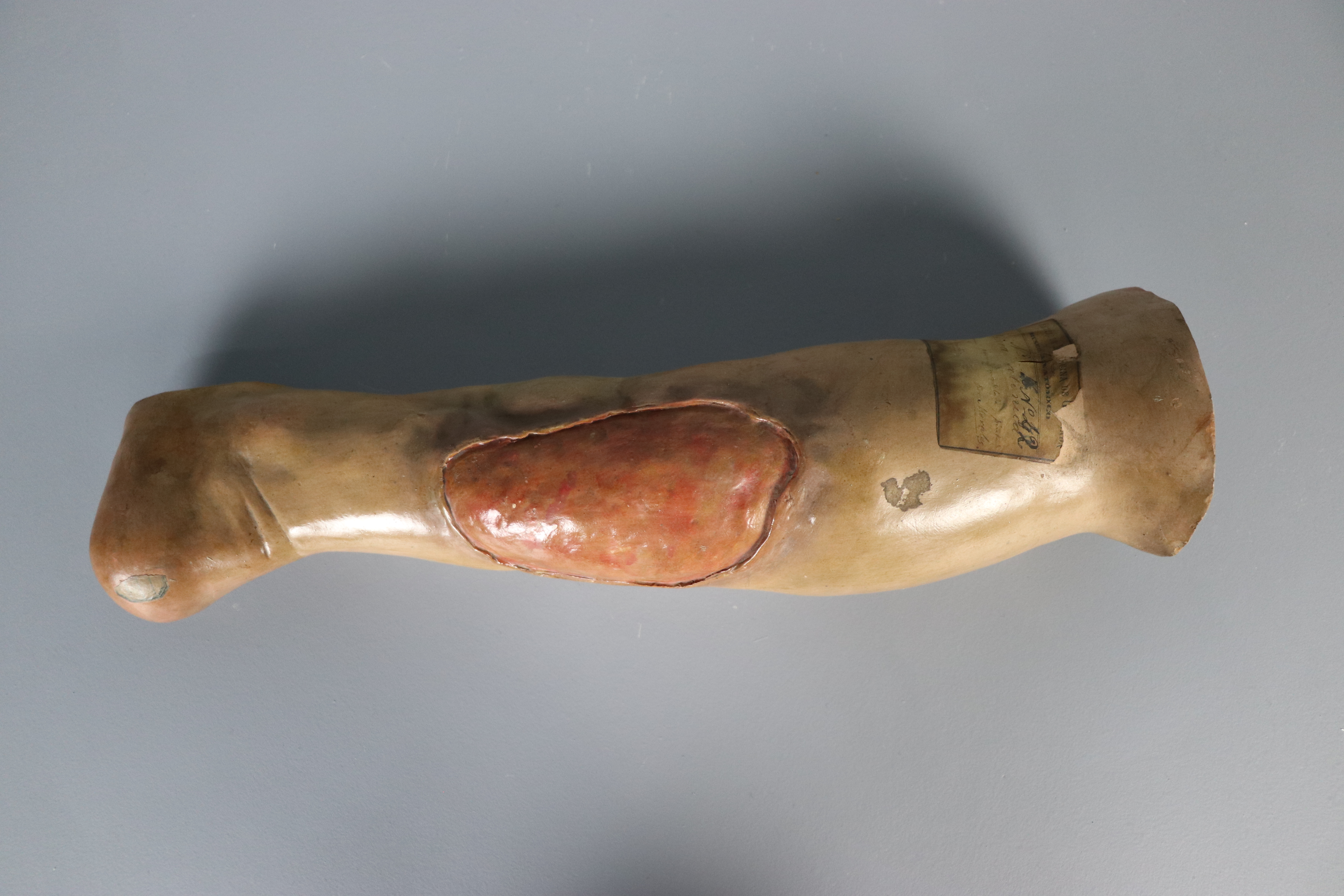 Molde en barro de cara posterior de la pierna, con amplia lesión ulcerosa rosada. Presenta el etiquetado original del Museo Anatómico con el diagnóstico, la numeración (n.º 5) y el catálogo (Dr. Entralla)