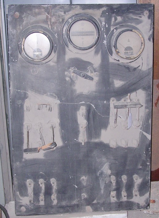Tablero con dispositivos e instrumentos para el control de una instalación eléctrica sobre una base de pizarra.