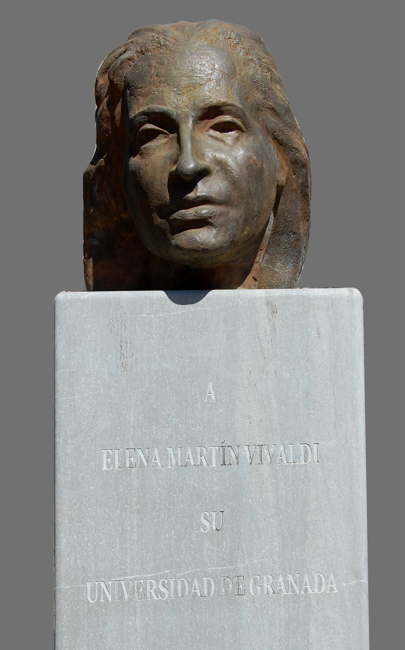 El autor dignifica y homenajea a la poeta granadina Elena Martín Vivaldi (1907-1998) de manera póstuma. La pieza modelada se ubica sobre una peana de piedra de Sierra Elvira donde se talla a bajo relieve "A ELENA MARTÍN VIVALDI SU UNIVERSIDAD DE GRANADA" en su cara frontal y en la parte inferior del costado izquierdo en letra más pequeña puede leerse: "DONACIÓN DE FUNDACIÓN UNICAJA"