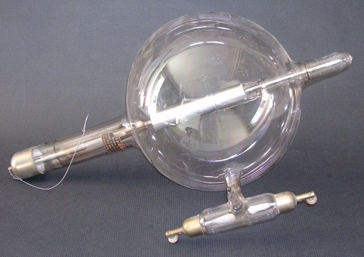Tubo de Crookes o de cátodo frío para la producción de rayos X. Se trata del primer modelo de tubo cuyo funcionamiento dependía de la aplicación de una corriente continua no superior a 100Kv que aceleraba e ionizaba el gas de su interior produciendo fluorescencia.
