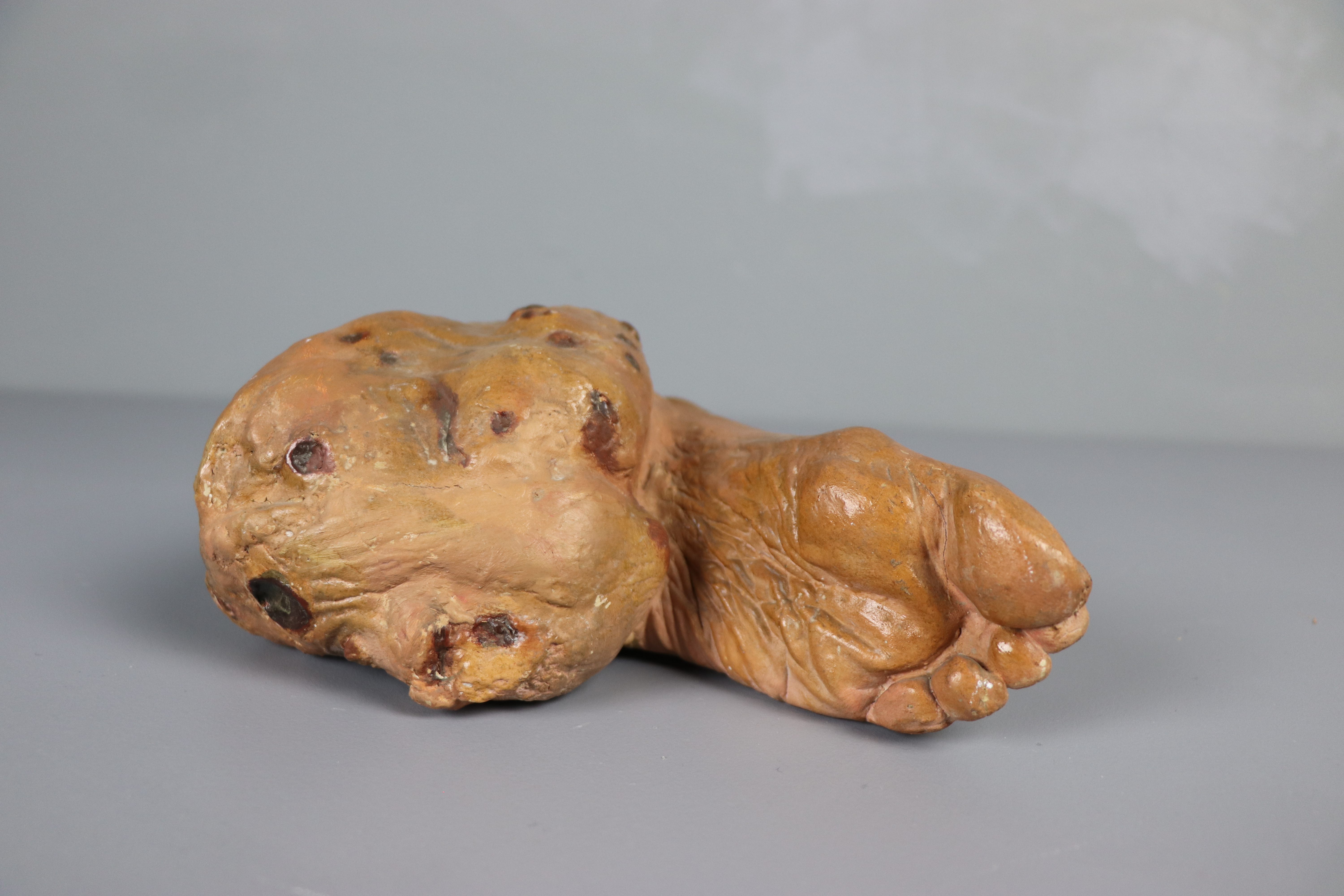 Modelo  en barro de una amputación a nivel del tercio distal de la pierna en la que se observa una gran masa tumoral que comprende el talón y planta del pie y que compromete a la piel con múltiples formaciones ulcerosas. No presenta etiquetado.