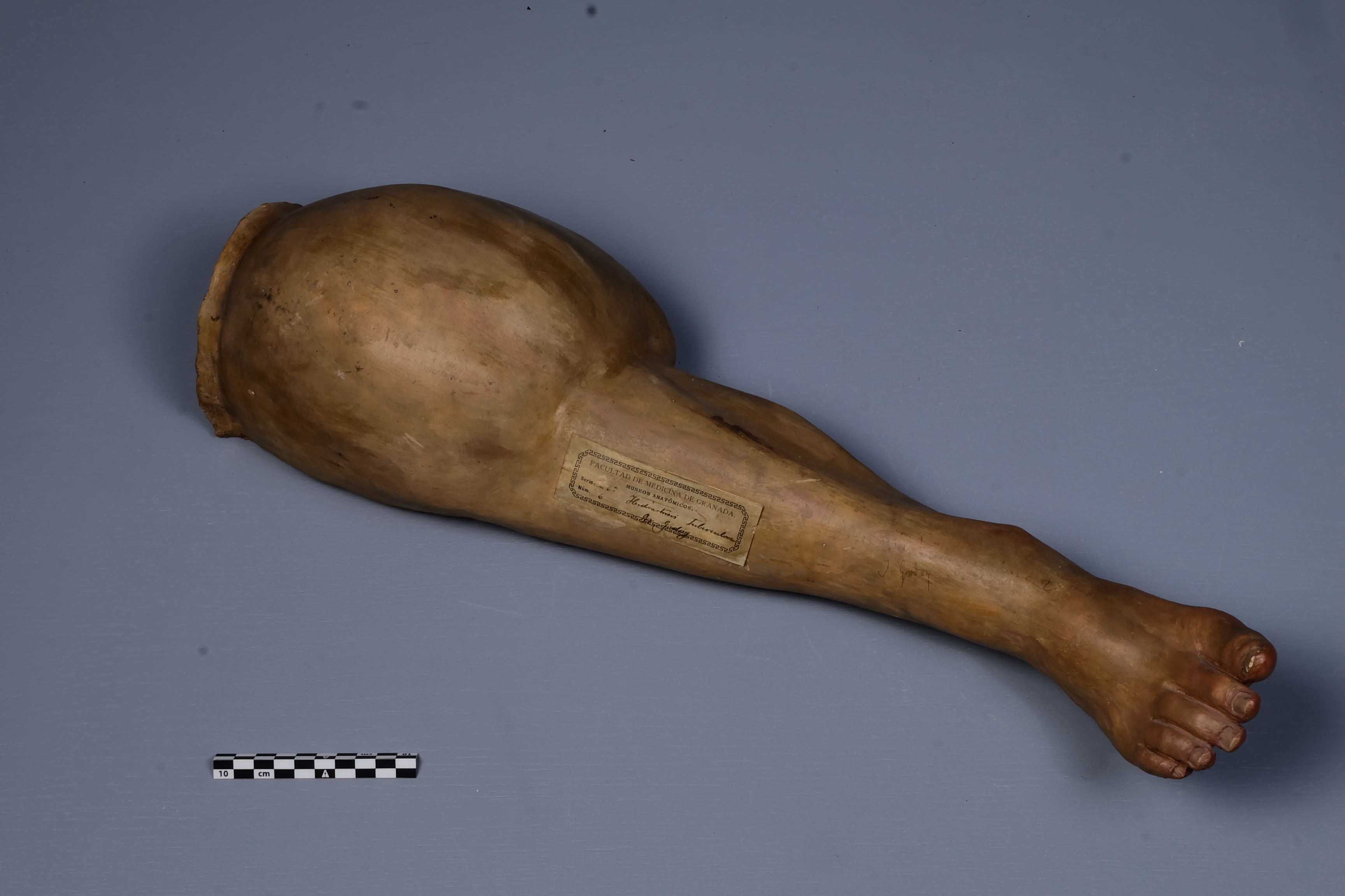 Molde en barro de rodilla, pierna y pie derechos, con gran inflamación de rodilla que interesa también al tercio proximal de la pierna. Presenta el etiquetado original del Museo Anatómico con el diagnóstico, la numeración (Serie 6, n.º 6) y médico tratante (Dr. Godoy)
