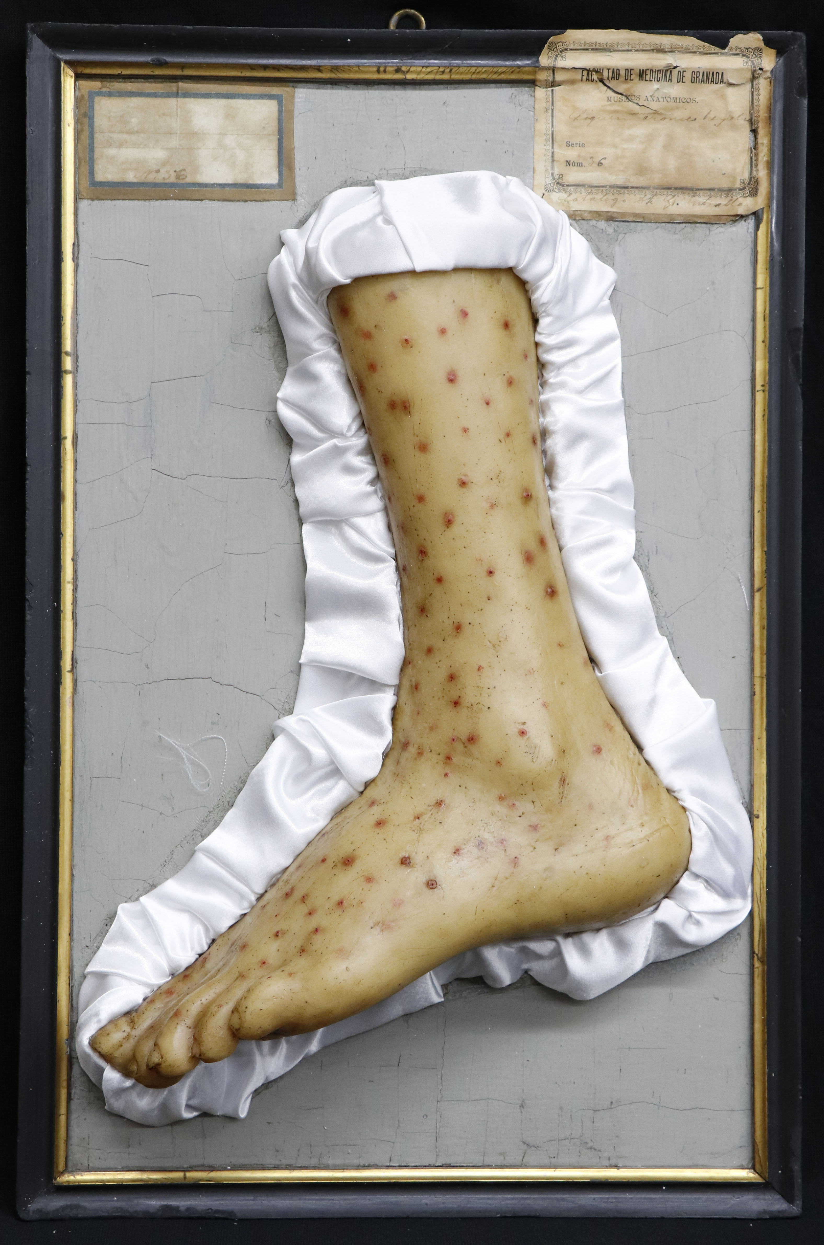Molde de cera del tercio distal y cara externa de pierna y pie izquierdos sobre tabla de madera enmarcada con múltiples pápulas y vesículas de pequeño tamaño, de coloración rojiza, alguna de las cuales se encuentran deprimidas en el centro y blanquecinas en su superficie. Etiquetado original del Museo Anatómico, con el diagnóstico y numeración (n.º 36) y catálogo (Dr. Entralla). Posee otra etiqueta en papel en el que consta el nombre del hospital (H. S. Juan de Dios), el diagnóstico y el médico Olavide, además de una doble numeración (n.º 46 y 36). En la parte posterior, muestra una lámina original en papel con la historia clínica detallada.