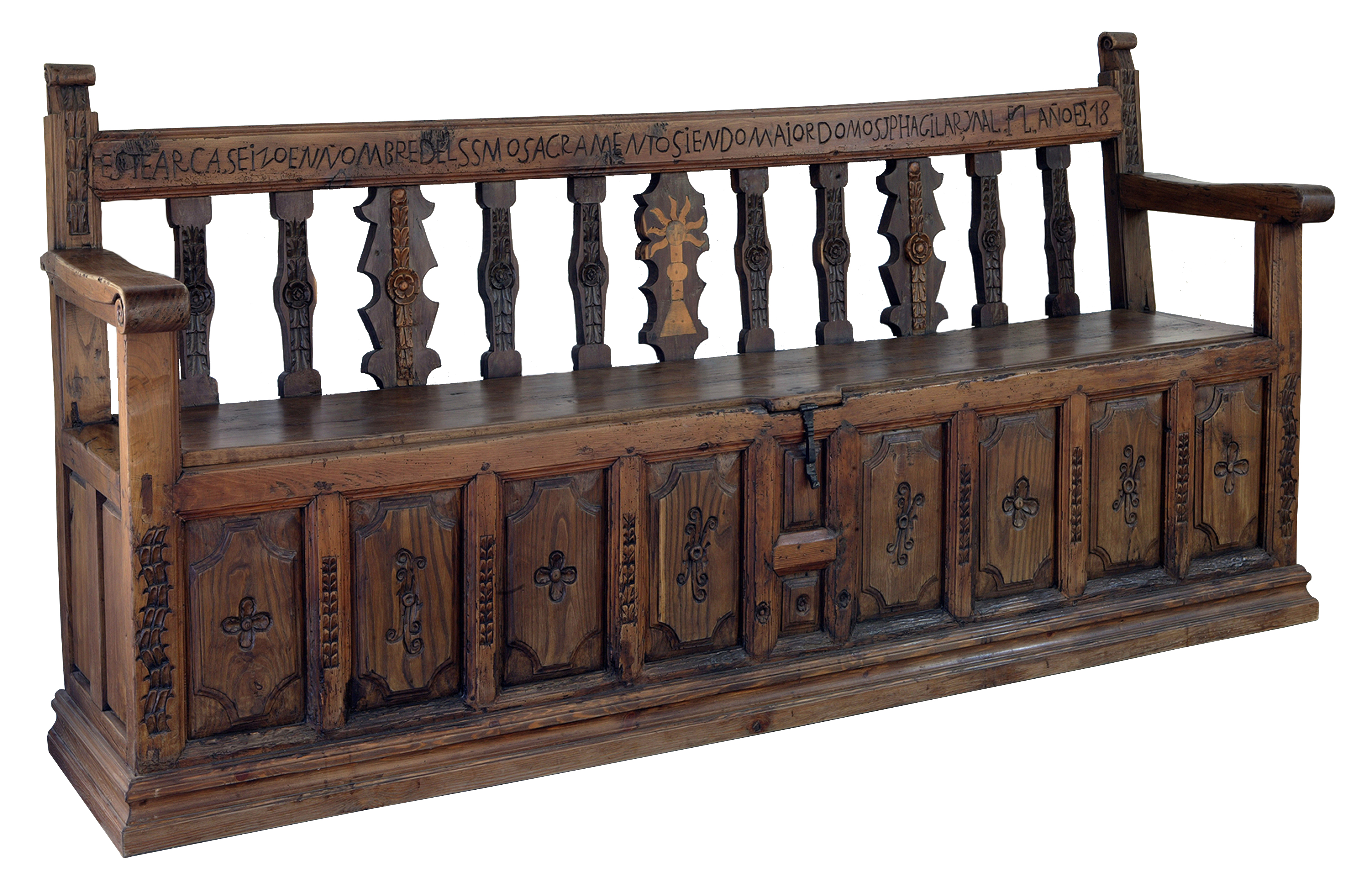 En el listón superior del respaldo está incisa la siguiente inscripción: "ESTE ARCA SE IZO EN NOMBRE DEL SS. SACRAMENTO SIENDO MAIORDOMOS JPH AGILAR Y ML. FSL. AÑO DE 18".