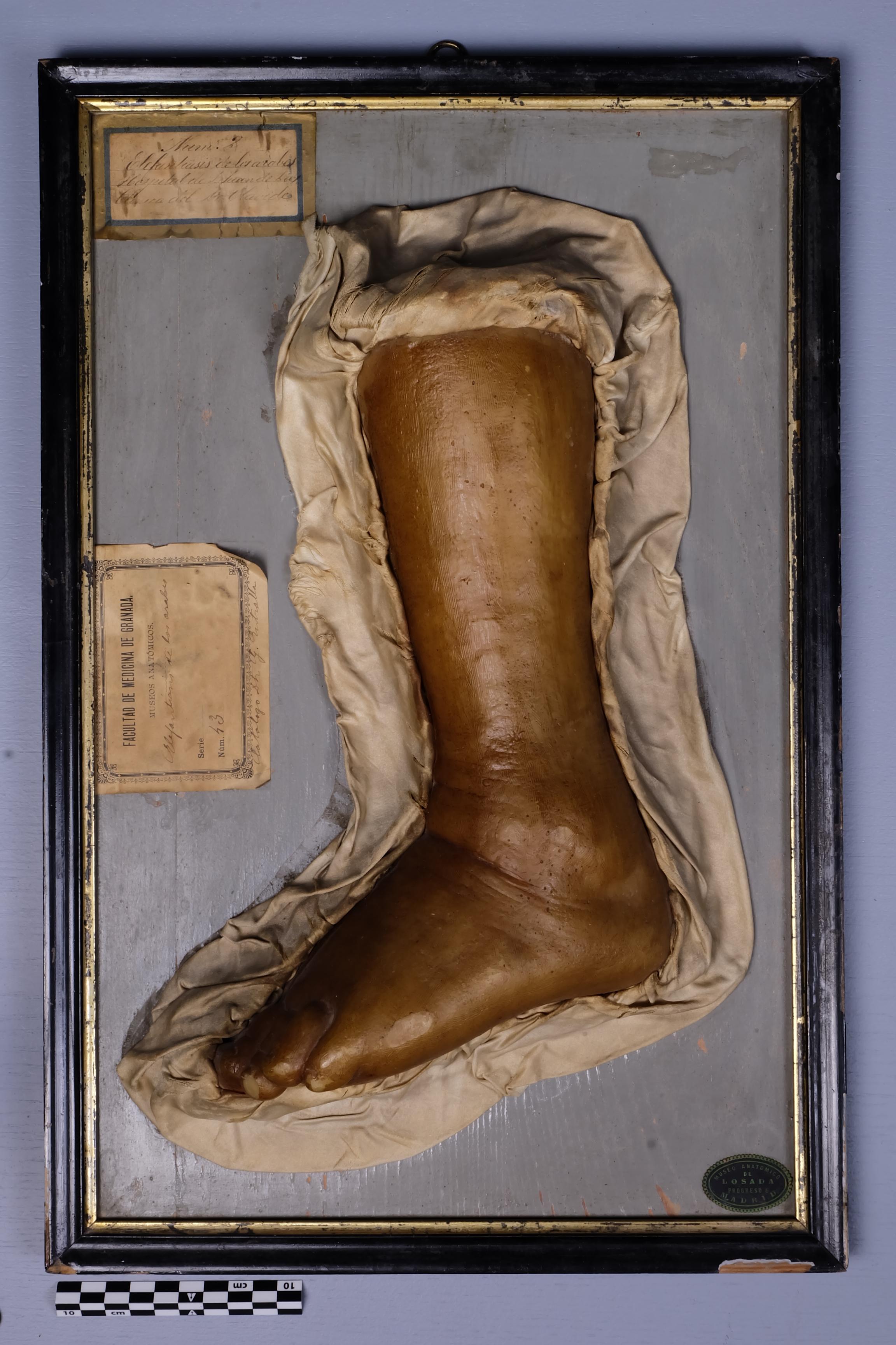 Molde de cera del tercio distal de pierna y pie izquierdos en posición lateral externa de un niño, sitiado sobre una tabla de madera enmarcada, con un notable edema regional. Posee un etiquetado original del Museo Anatómico con diagnóstico, numeración (n.º43) y catálogo (Dr. Entralla). También tiene otra etiqueta en papel con numeración (nº2), nombre del hospital, diagnóstico y clínica del médico (Dr. Olavide). En el ángulo inferior derecho hay una pequeña chapa metálica con la inscripción LOSADA. En la parte posterior lleva una lámina original en papel con la historia clínica detallada