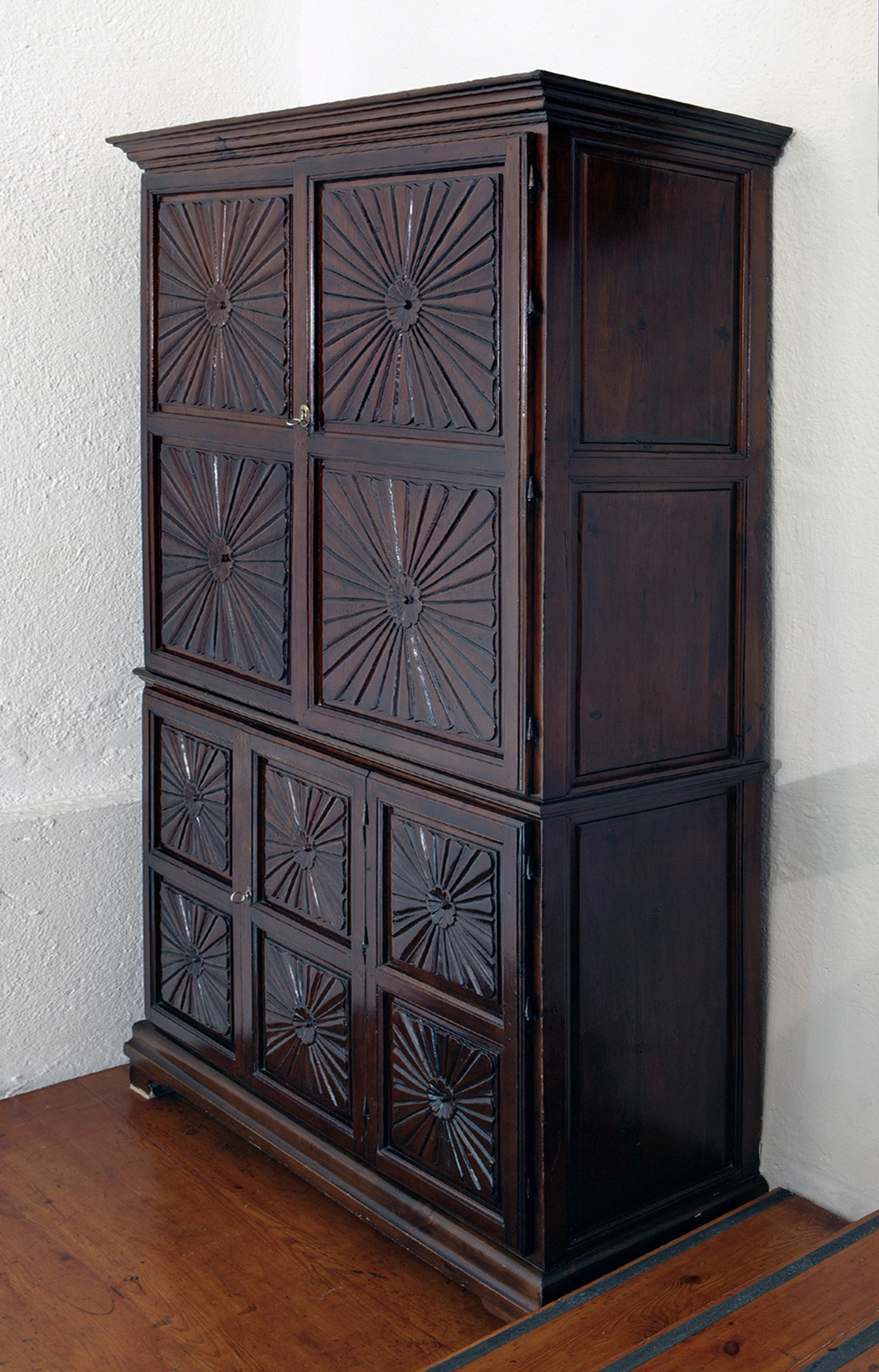Este armario de tipo castellano presenta una estructura bien definida por la propia armadura del mueble. Coronado con una cornisa moldurada y apoyado en cuatro pies recortados, está articulado en dos cuerpos de madera de pino barnizado en nogal: el cuerpo superior, de mayor tamaño, muestra en su frente dos paneles u hojas cuya decoración se basa en la división de cada una en dos cuarterones con centros radiales de talla. El cuerpo inferior, separado del anterior por una ligera moldura, se compone de tres puertas con la estructura decorativa ya comentada para la parte superior. Los frentes laterales muestran la misma ordenación pero sin adornos.