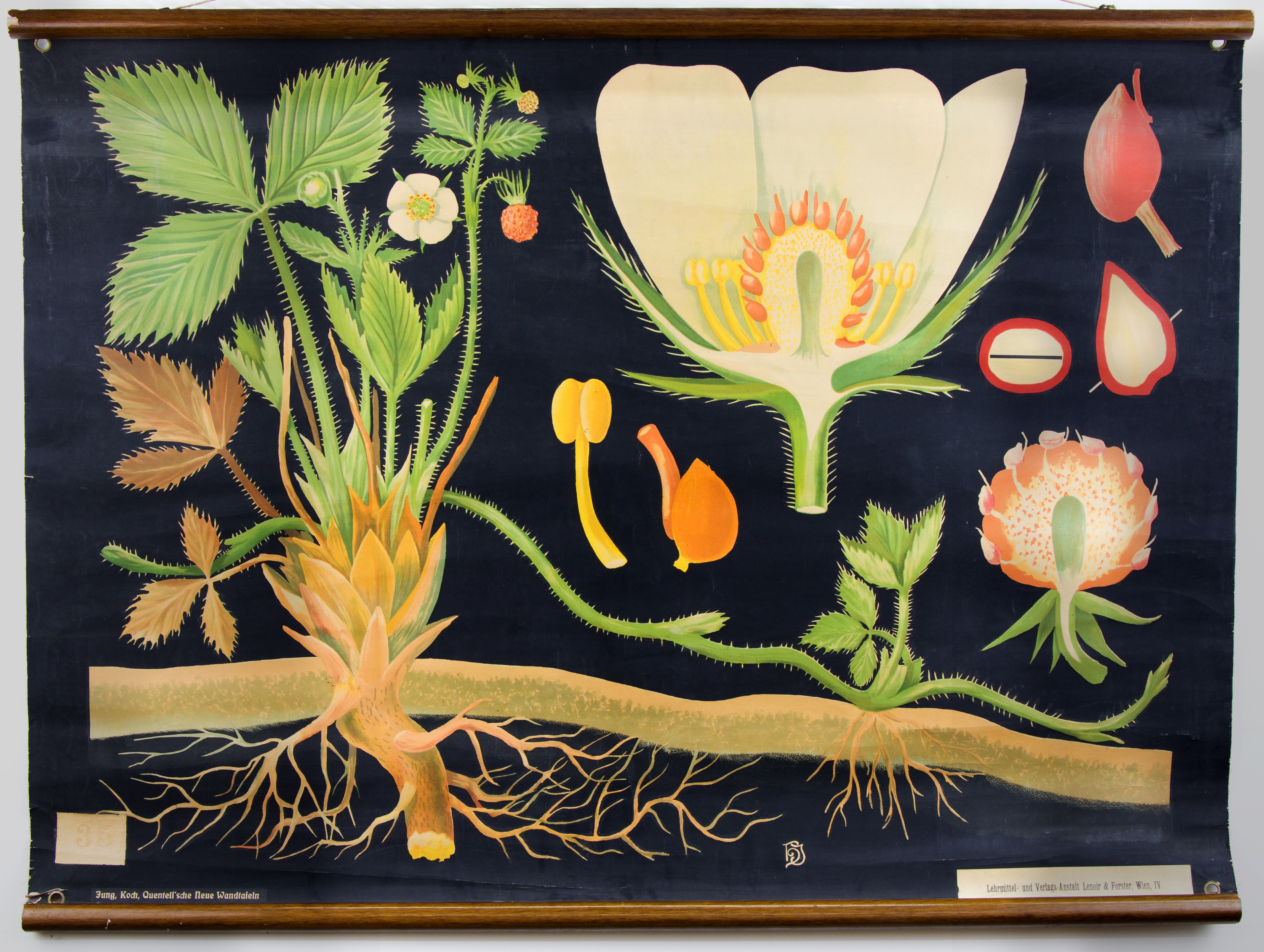 Esta lámina muestra, sobre un fondo negro, distintos aspectos de la anatomía de la fresa silvestre o Fragaria vesca: el desarrollo de su raíz, su crecimiento, los detalles externos e internos de sus flores y frutos, etc.