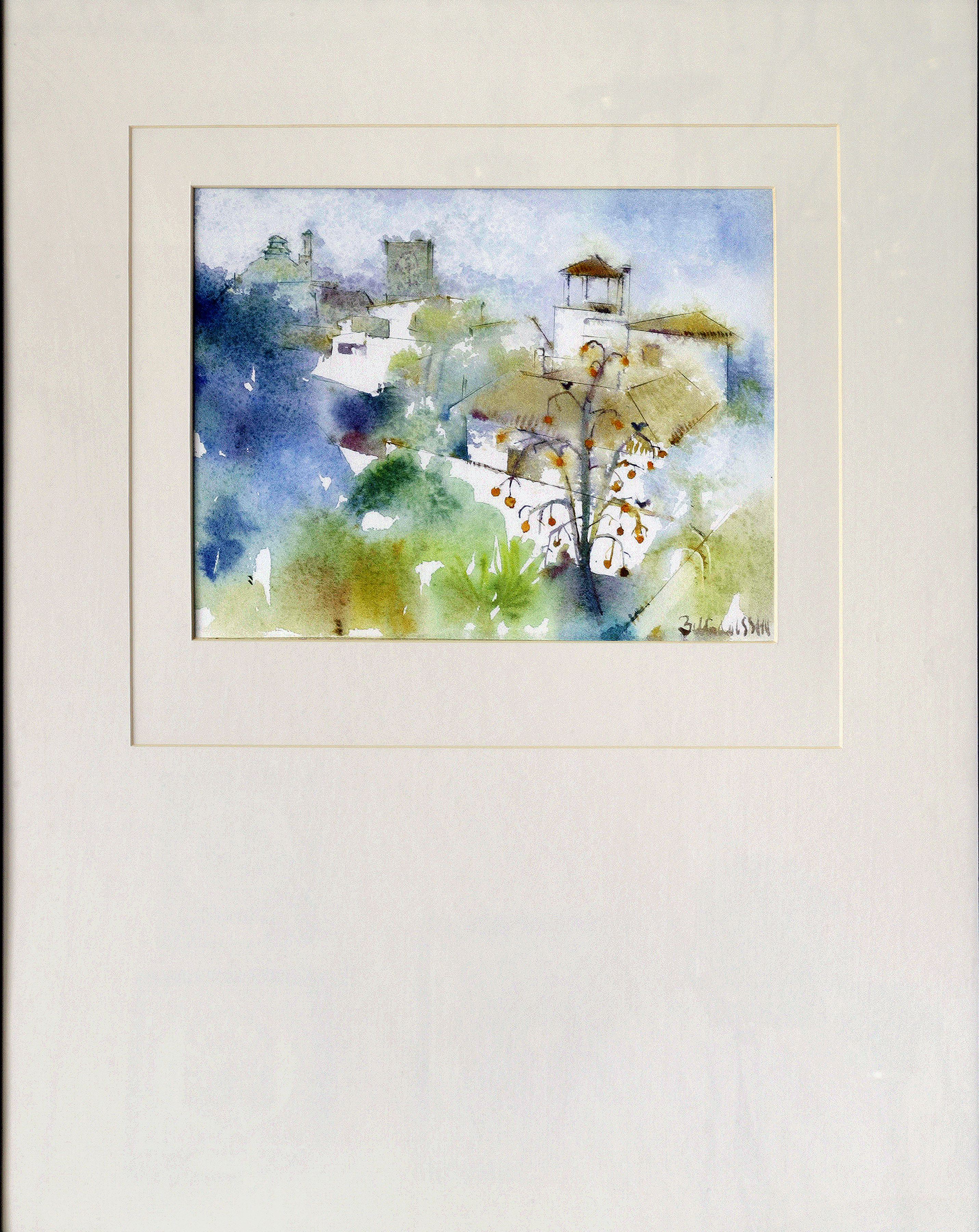 Panorámica del barrio del Cenete compuesta de un blanco caserío apenas dibujado, con parras de vid y granados en primer término. Al fondo a la izquierda emerge la silueta la catedral de Granada, identificada por el cimborrio y la torre. Como es habitual en las acuarelas de Ricardo Bellido, el dibujo apenas está presente, dado que pretende la ordenada mezcla de las manchas de color.