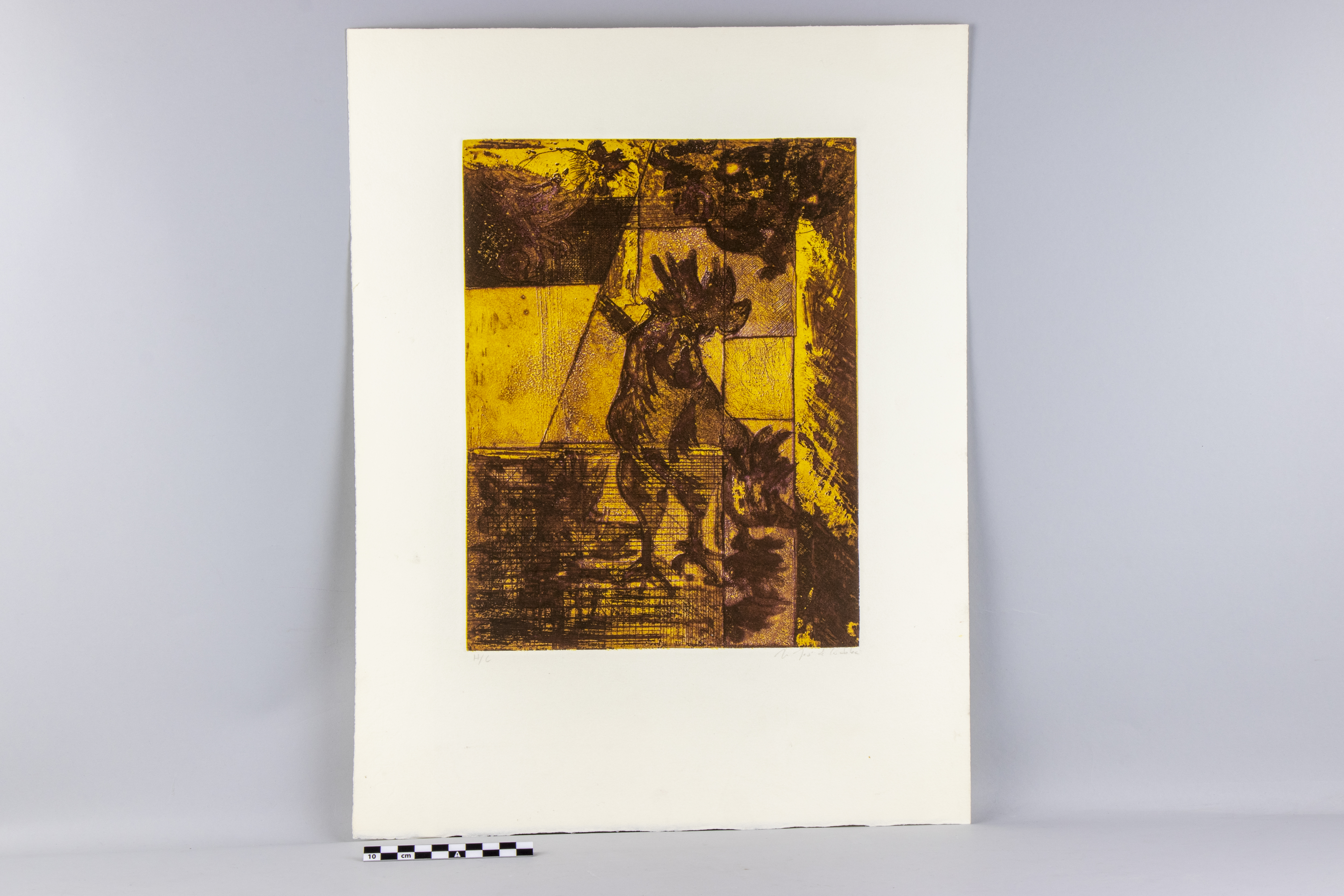 Sobre un fondo dividido en secciones irregulares mediante líneas que forman polígonos cuadrangulares de diferente tamaño, se recorta en el centro de la estampa la figura de un ser con patas y cresta de gallo. La estampa es rica en texturas y basa su cromatismo en dos colores, amarillo y marrón, generando tonos intermedios mediante los diferentes grados de incisión en la plancha de zinc.