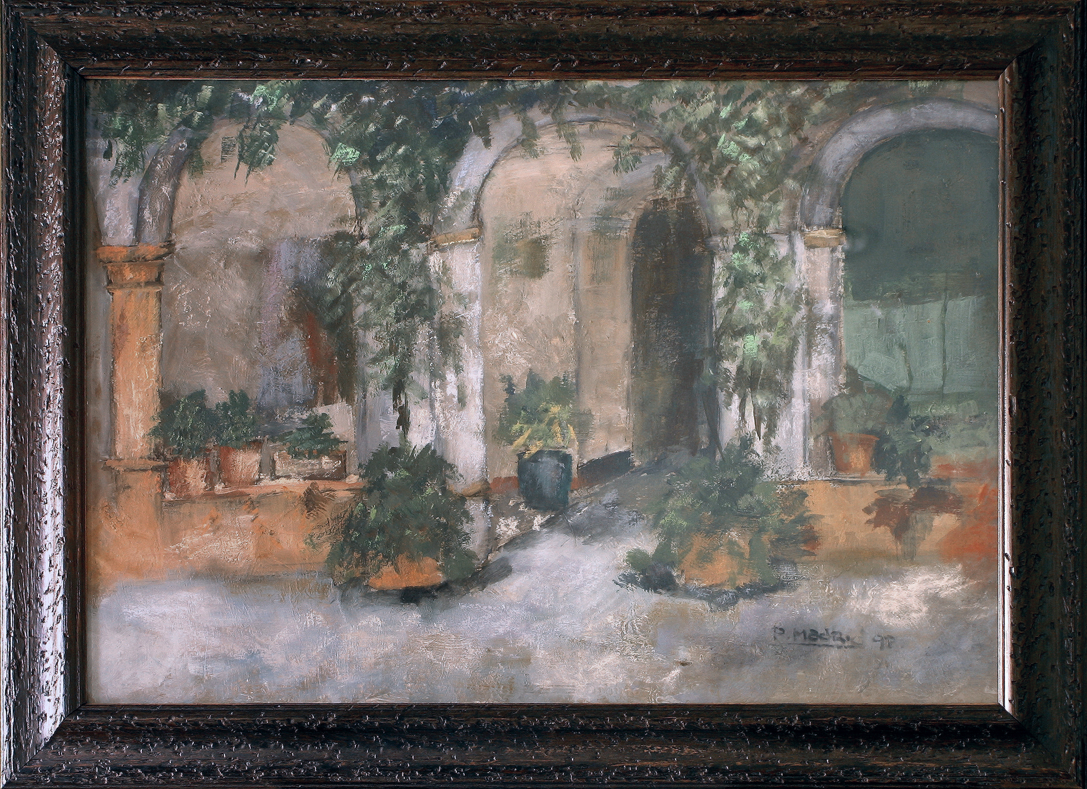 Pintura al óleo de carácter figurativo que representa el interior de un patio perteneciente a una antigua casona andaluza. En la pintura vemos tres de los arcos del patio, que ocupan todo el ancho del cuadro, quedando ligeramente cortado el de la derecha. El central se apoya sobre pilares mientras el izquierdo se apoya sobre una columna y uno de los pilares que comparte con el arco central. El derecho comparte también un pilar con el arco central, quedando su apoyo derecho fuera de la escena. Sobre los pretiles, en el suelo y cubriendo los muros exteriores podemos ver macetas y hiedras que anticipan el acceso al interior de la vivienda.
