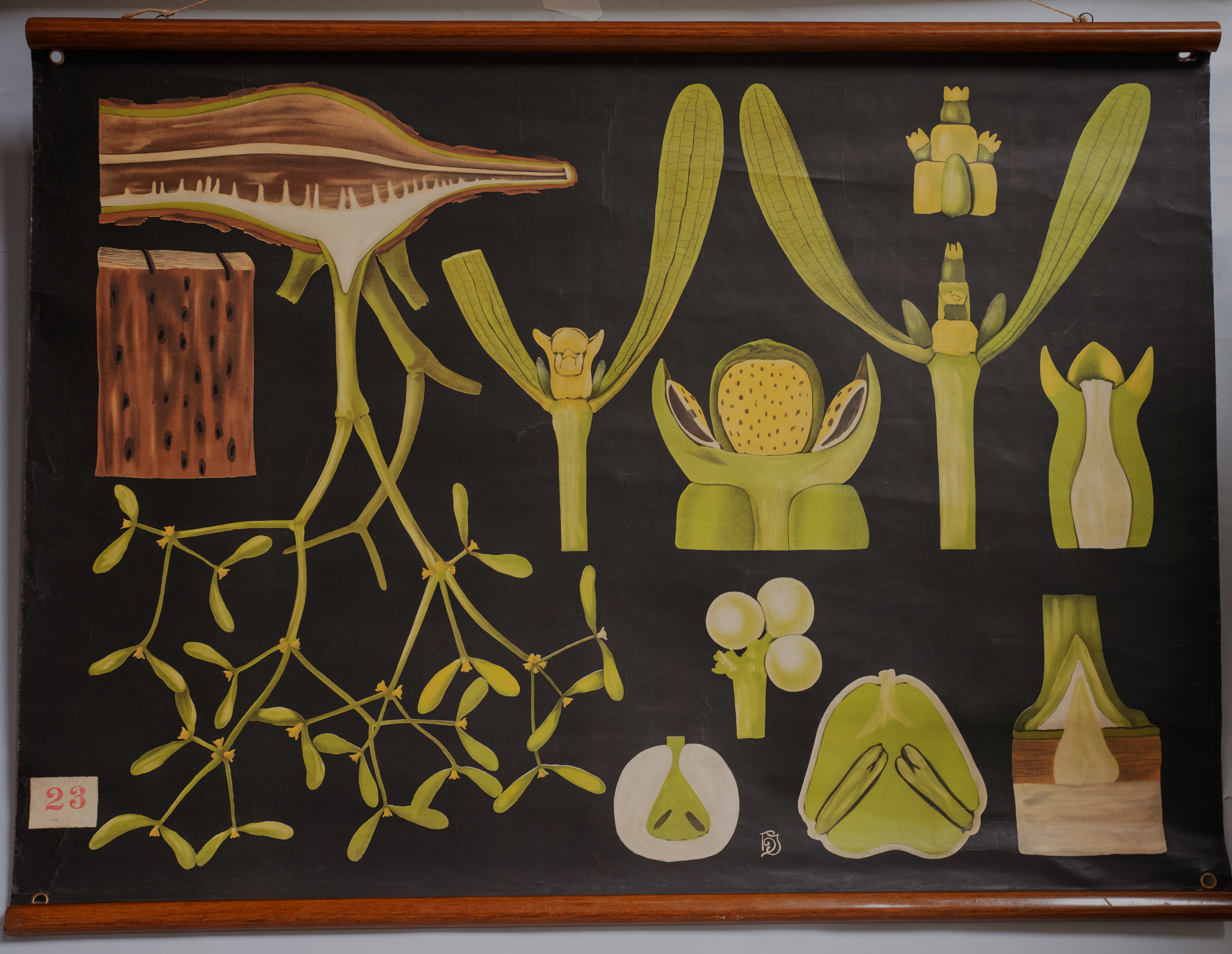La lámina de papel entelado nos muestra, sobre un fondo negro, distintos aspectos de la anatomía del muérdago (Viscum album) como la forma en la que esta planta semiparásita se ancla a las ramas de su huesped o el aspecto interno de sus diminutas flores y de sus pequeños frutos o bayas traslúcidas muy apreciadas por las aves.