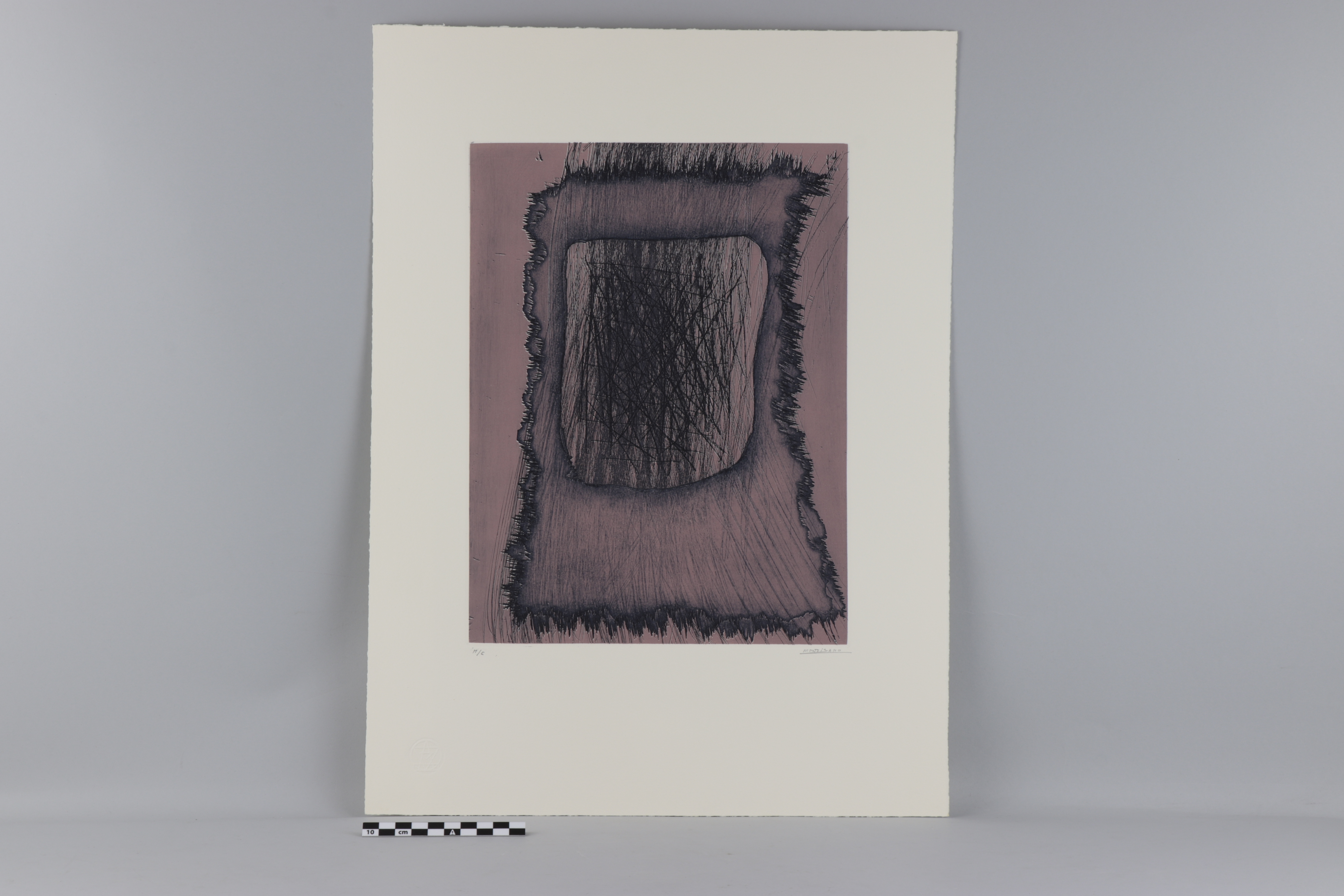 Composición abstracta que hace uso de la línea y las formas cuadrangulares para crear un juego de intensidad de tonos en la estampación, contrastando a su vez las diferentes texturas producidas por el aguafuerte en la plancha de zinc. La mancha acuosa parece irradiar desde el centro del soporte, mientras que en el centro se superponen las líneas previamente rasgadas sobre la plancha.