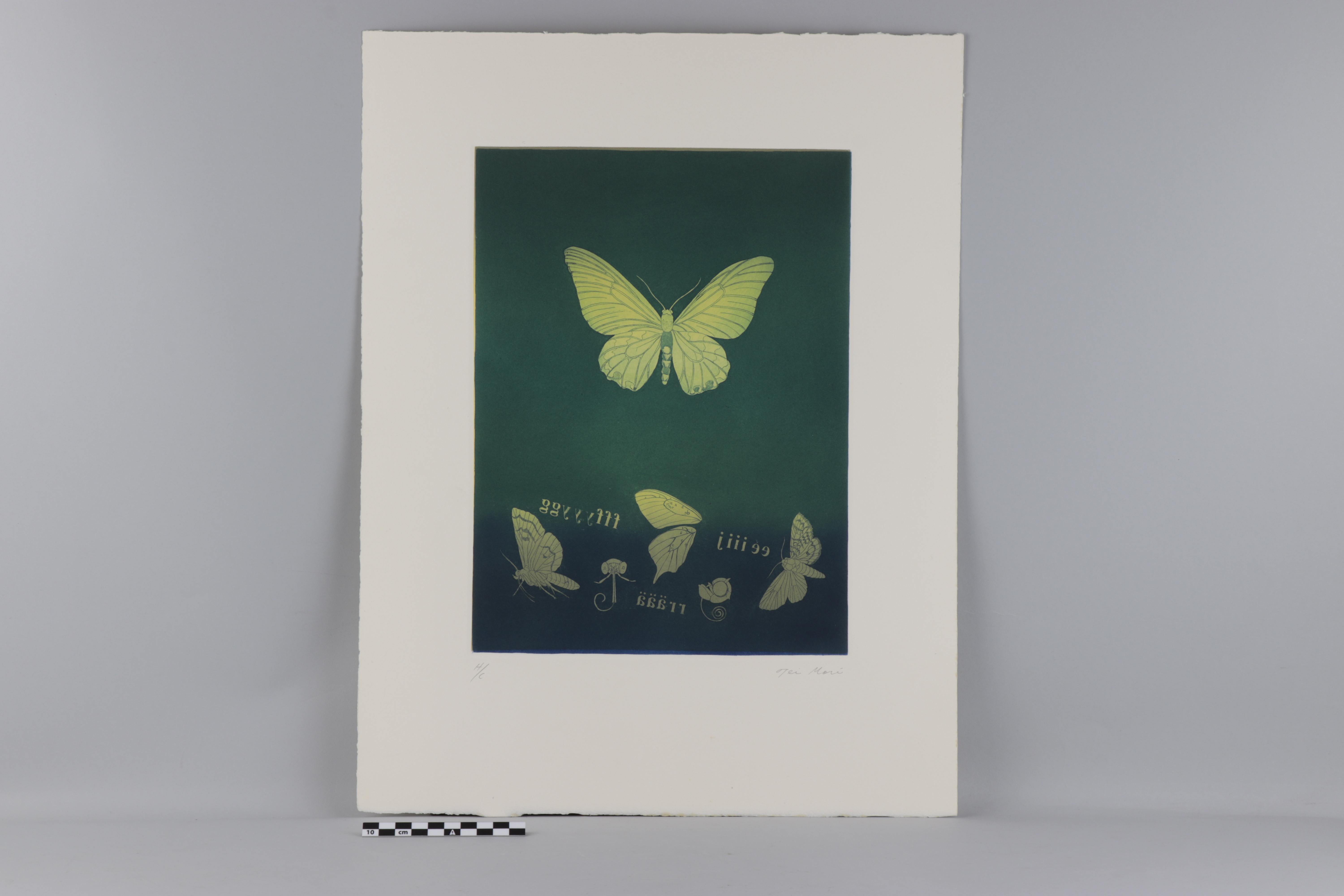 La obra gráfica de la artista nipona Teiko Mori recurre frecuentemente a elementos de raíz simbolista y surrealista. En esta estampa producida en la Carpeta 6 E “2ª Suscripción”, la composición está dominada por el juego luz-oscuridad o elemento-vacío, que la artista consigue mediante la inserción de mariposas aisladas sobre un fondo de tinta plana en verde oscuro que se aclara a la luz del insecto que ocupa el área central.