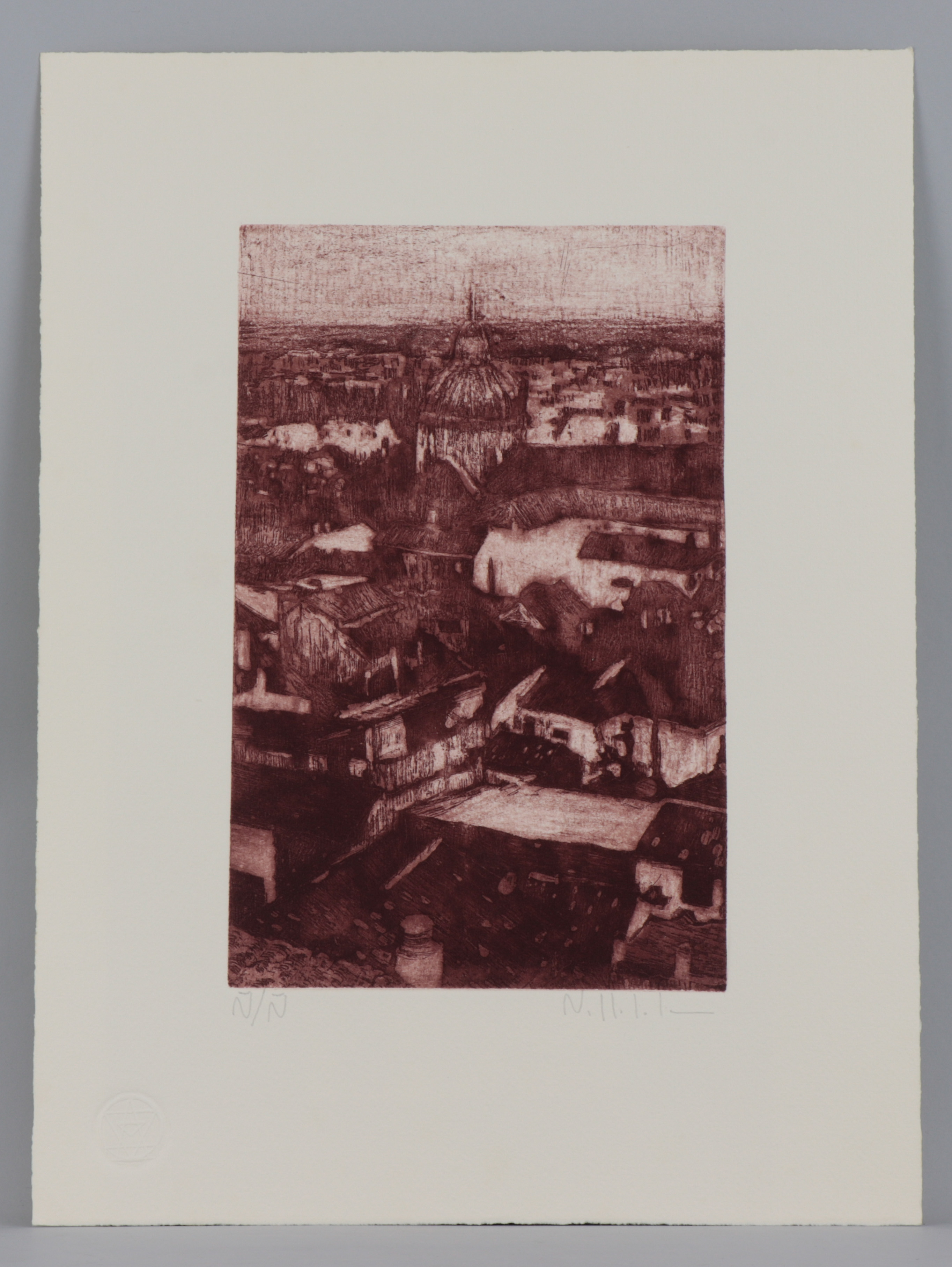 Grabado con matriz de una plancha de zinc. Estampado a una tinta, carmín, en hueco, sobre papel superalfa 250 gr. En él se representa una población con casas de paredes blancas destacando en el centro de la composición la cúpula de una iglesia, probablemente de Santo Domingo ya que es una vista del barrio del Realejo de Granada.